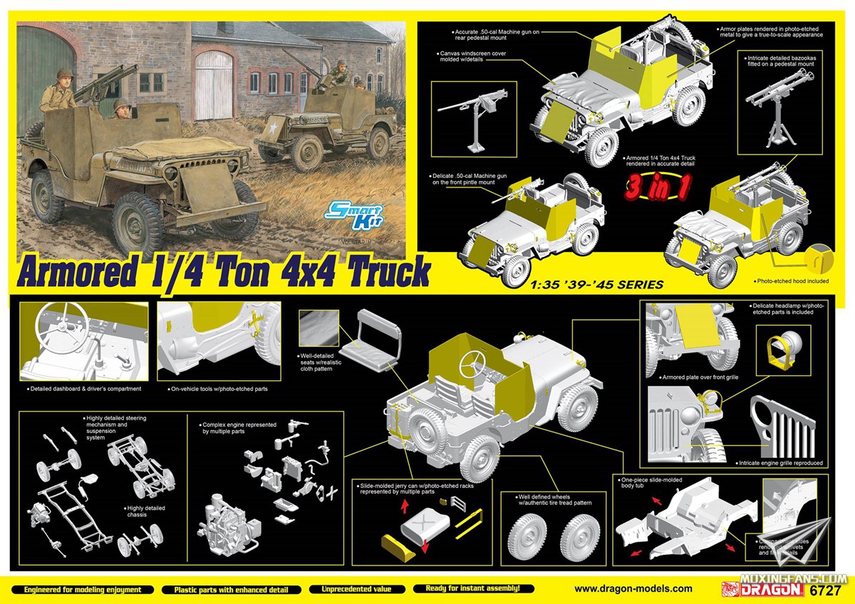 6727 1/35 1/4吨威利斯装甲吉普车 附.50重机枪(3合1) 精密版 ¥168 1/4吨威利斯军用4轮驱动吉普车是二战中美军的标志性车辆,在战场上被广泛使用。这种越野吉普车具有很强的通用性,可以根据战地需要装备多种不同的武器。威龙在多年之前推出过NO.6714 1/4吨威利斯装甲吉普车 附.50重机枪,而此次我们将要推出的NO.6727是它的后续产品。这款三合一版本的新品是一款加强型套件,可以选择在车体的三个不同位置安装不同的武器装备:在车体前部安装.50口径重机枪、在后车厢内安装双联装巴祖卡火箭筒或在相同的支架上安装.50口径重机枪。板件内容以NO.6714为基础,一体成型式的坚固车架确保了各部件组装时的准确性,模型制作者可以选择将发动机舱盖制作成打开状态以展示内部精密逼真的发动机部件,车体上加装的防护装甲板为蚀刻片零件,具有真实的比例尺寸。套件中还提供了其它一些金属蚀刻片零件用来增加细节效果,如车载工具支架、发动机舱盖固定器和各种绑带。现可以进入环球UML HOBBY官方网店及各大威龙授权经销商网店进行预订! ![]() 6946 1/35 德国超重型自行臼炮 60cm 040号/54cm 041号 (4 合 1) ¥329