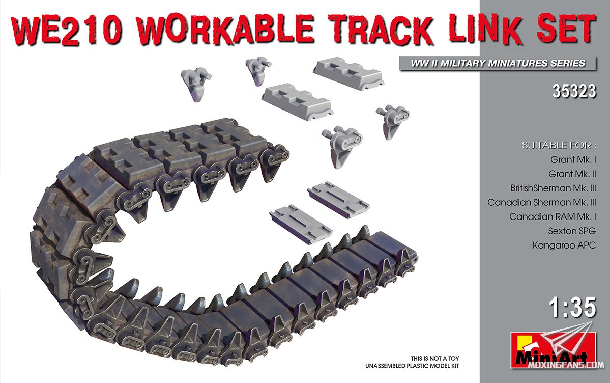 MINIART今天发布了另一款活动履带,为WE210型。从结构来看,和之前推出的T41活动履带结构类似,只是接地面有所区别。根据官方描述,这款履带可以用在以下型号: Grant Mk. I,Grant Mk. II,BritishSherman Mk. III,Canadian Sherman Mk. III,Canadian RAM Mk. I,Sexton SPG,Kangaroo APC。