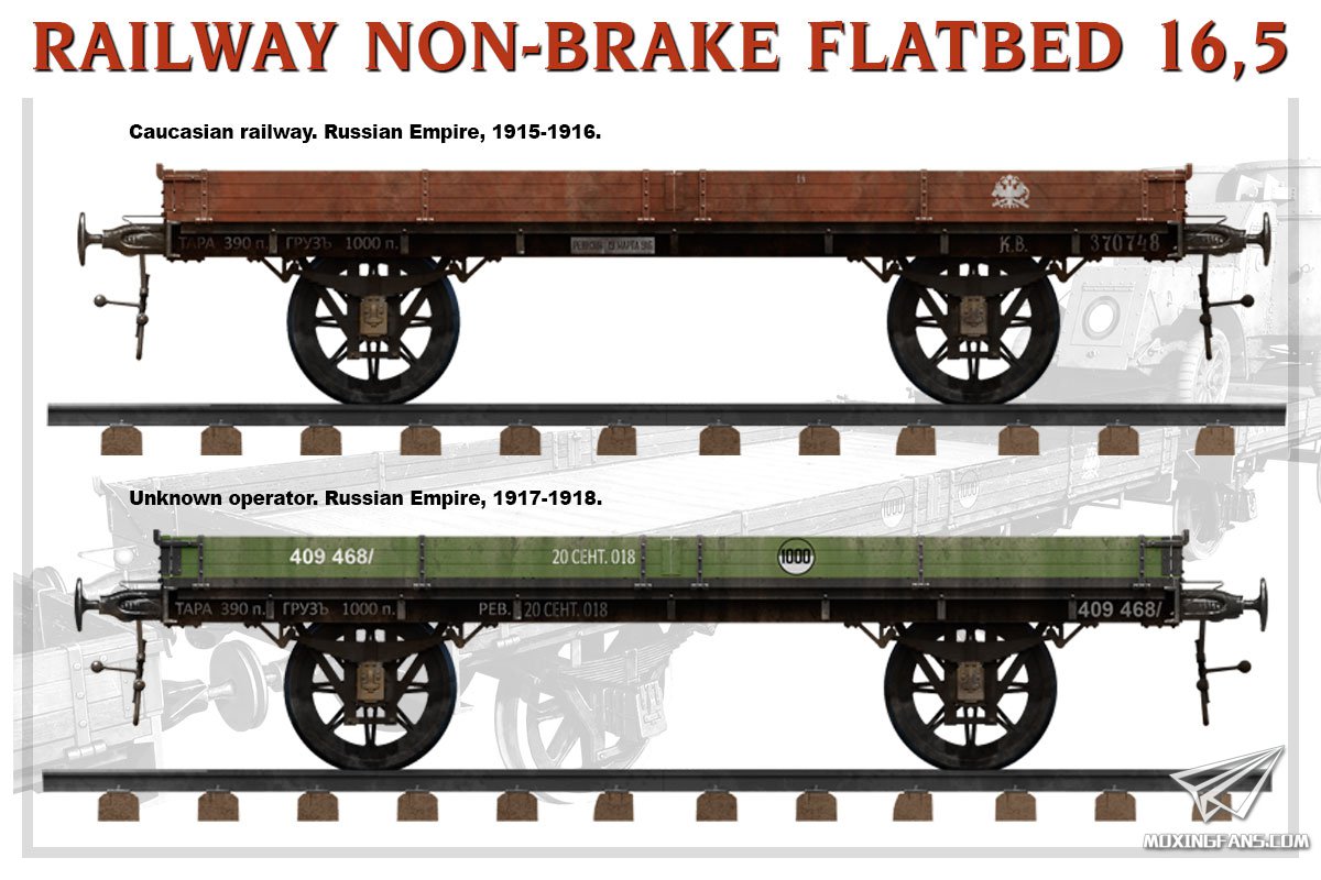 MINIART发布了一款新的铁路平板车,是比较冷门的1900年前后的型号,没有制动结构。根据官方描述,这盒套件的特点如下: 侧面的挡板可以封闭或者打开;可以安置在苏联轨距或者欧洲轨距的铁轨上;车轮可转动;附带蚀刻片零件;附带苏联轨距的铁轨;8种涂装可选。