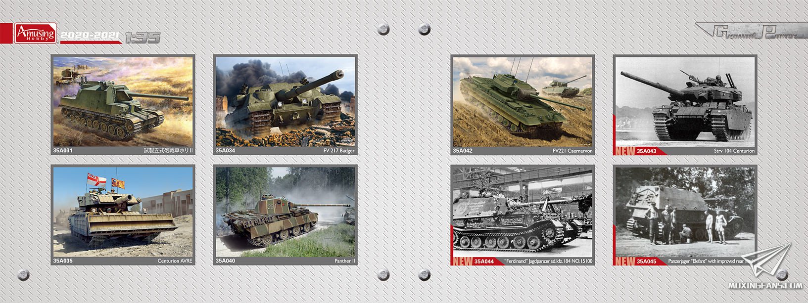 AMUSING HOBBY发布了2021年的年刊,看起来接下来的新品主要集中在百夫长的子型号以及费迪南/象式坦克歼击车这两个题材方面,此外1/48比例的飞机也有几款,基本也都是图纸机系列。