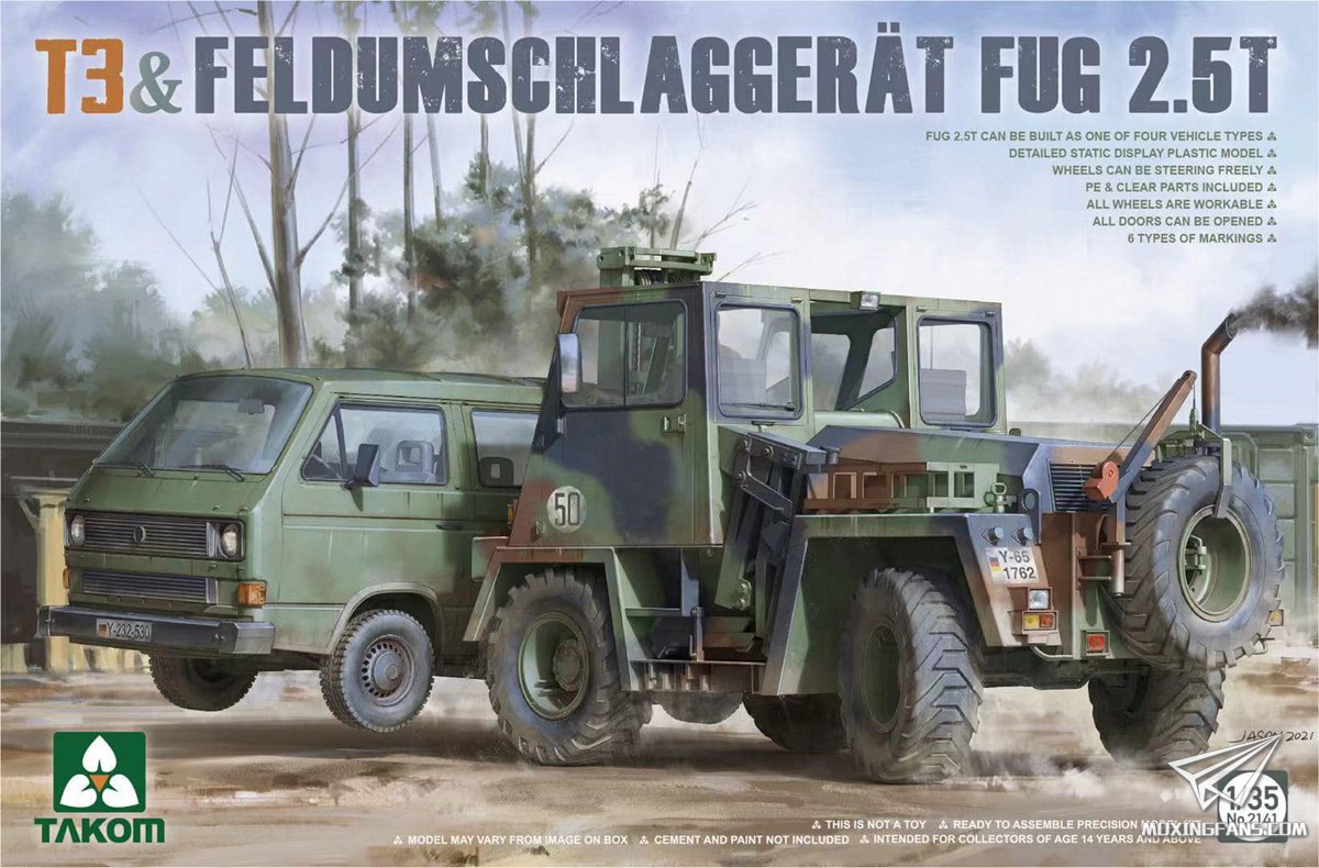 三花(TAKOM)发布了两款新品: 2141:1/35 T3面包车&FUG 2.5吨叉车 叉车可制作成四种形态;车轮和转动和转向;舱门可制作成打开或关闭状态;附带蚀刻片和透明件;6款涂装可选。