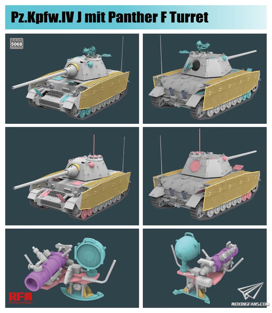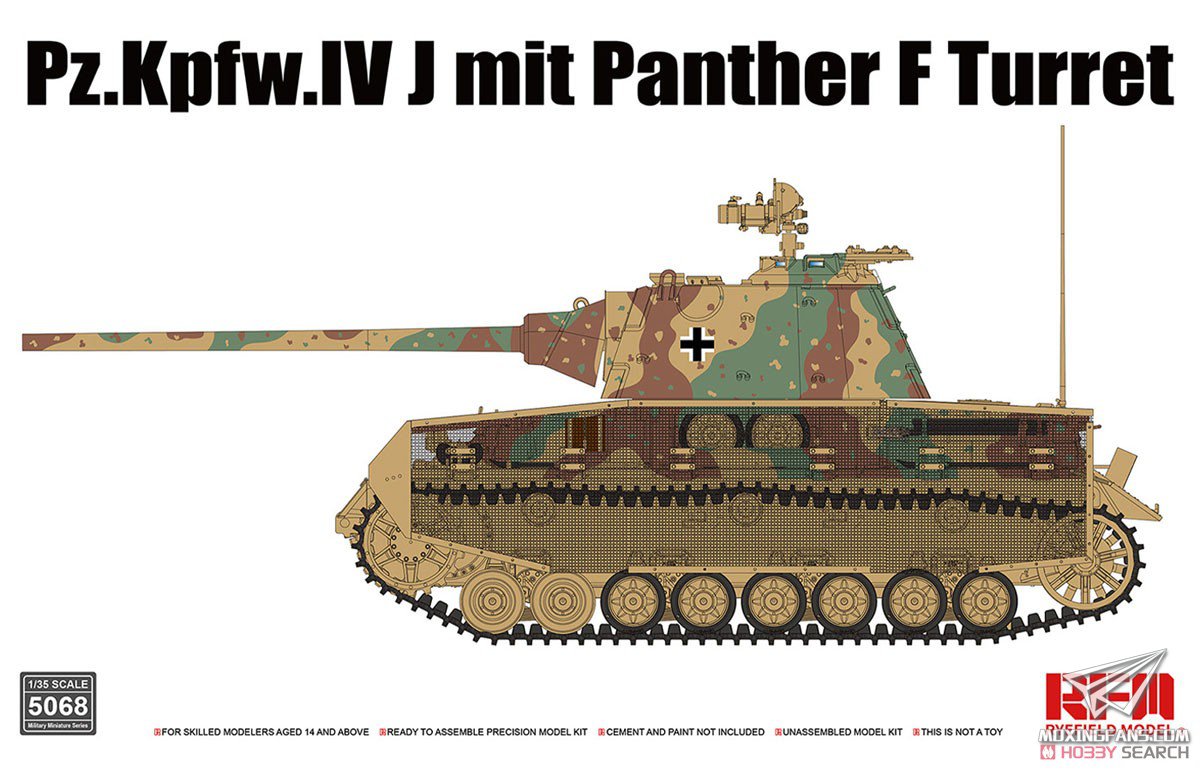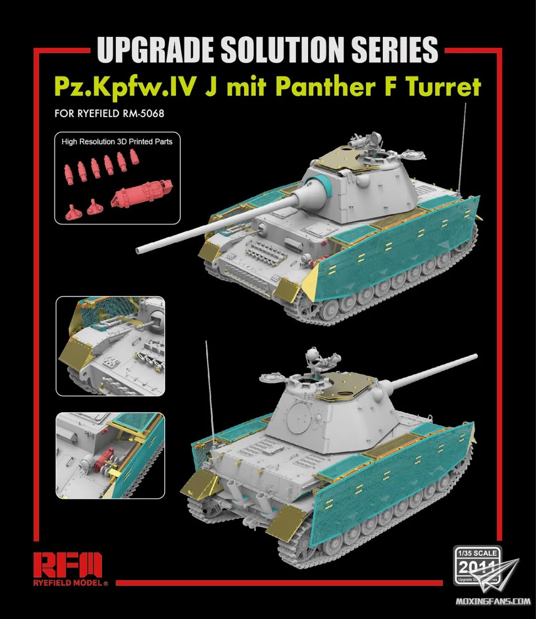 RM-5068:1/35 四号坦克J型豹F炮塔 这盒套件基本可以看做豹F和四号J的结合体,配有活动履带和蚀刻片,新增了前部的2对钢轮。