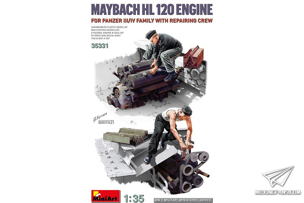 MINIART发布了一款新品:1/35比例三号和四号坦克系列通用的迈巴赫HL120发动机附维修人员。根据官方描述,这盒套件将附带迈巴赫HL120发动机,2名兵人和工具箱,配有相应的蚀刻片和水贴。