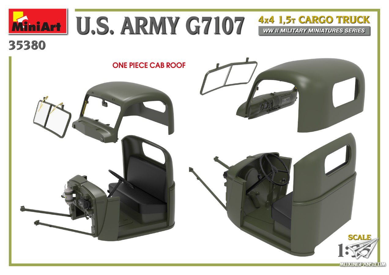 MINIART发布了一款新品:1/35比例的美国G7107 4X4 1.5吨货运卡车,这是MA新项目:传奇G-506系列中的第一弹。从介绍来看这款新品为全新开模,附带发动机和完整的底盘结构,带有1名兵人,8只油桶和蚀刻片,4款涂装可选。