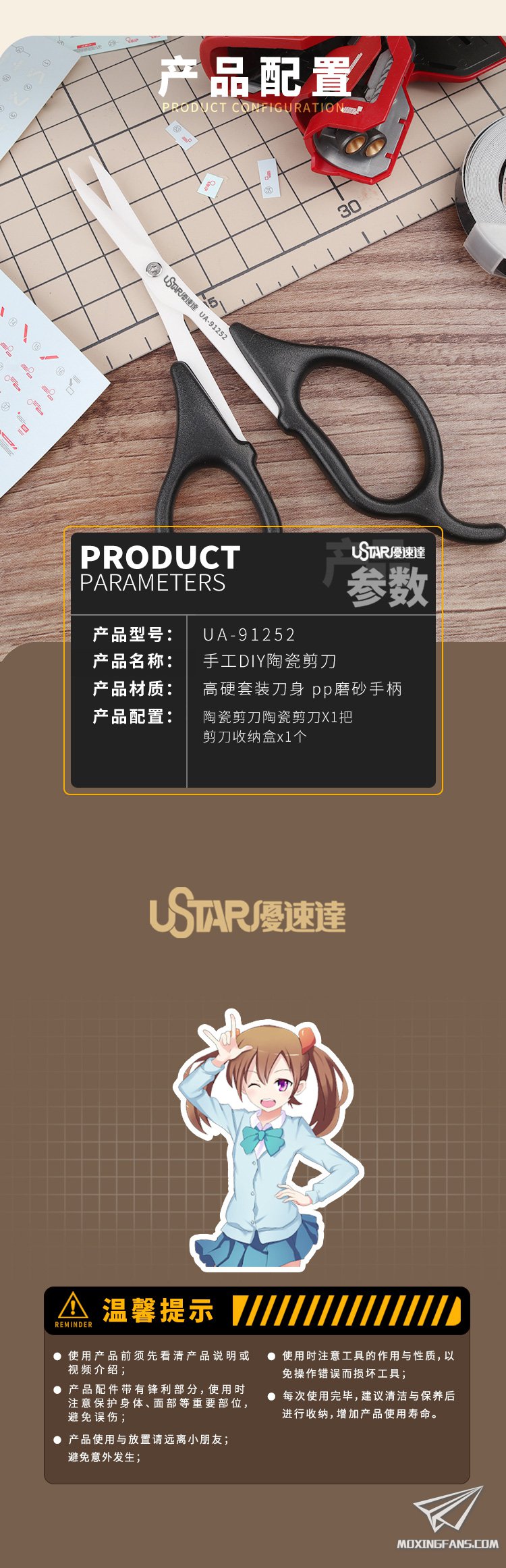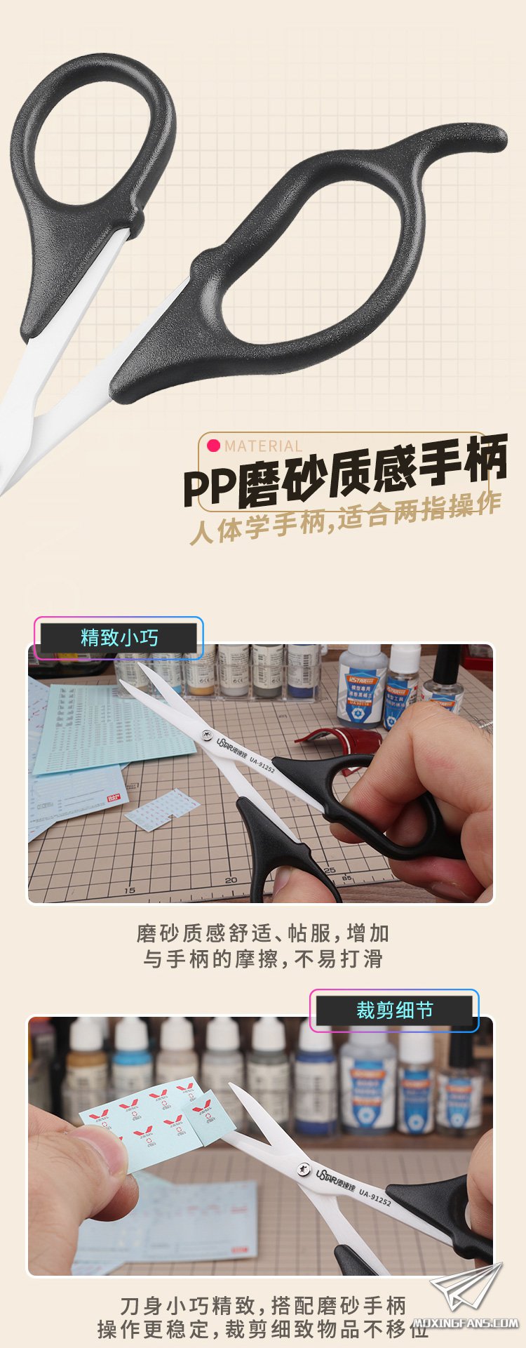 相对于通用型工具,模型专用工具在材质方面会更加考究,精细度和耐用性也有更高的提升,优速达 UA-91252手工DIY陶瓷剪刀就是专门为模型制作者量身打造的一款剪切工具。这把小剪刀采用陶瓷作为主要材质硬度更高,切面不起毛边,刃口契合度高,即使纤薄材质也能轻松剪切,刀身永不生锈而且不会伤手,是制作模型过程中的好帮手。