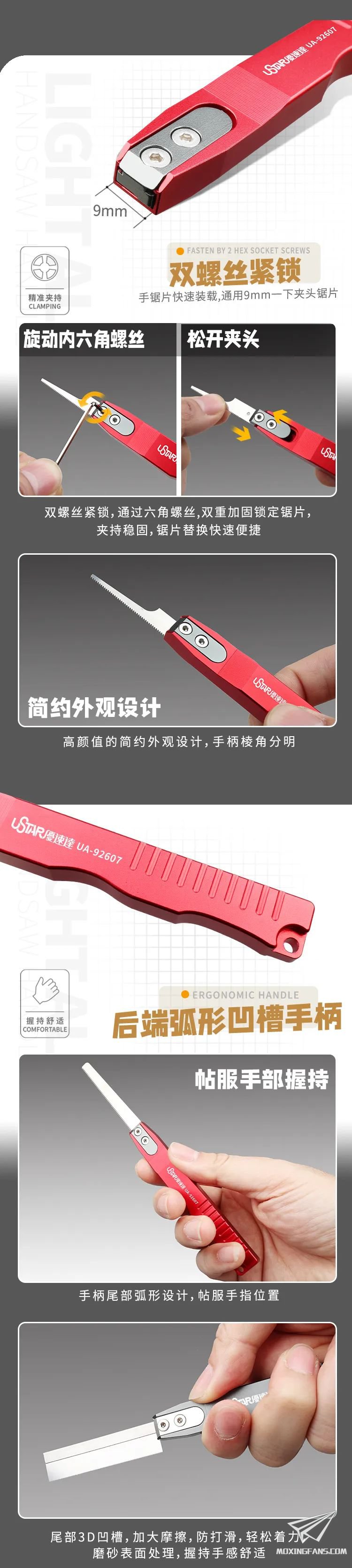 在模型改造中,不管是切割零件还是切割胶板,都需要使用到切割手锯。市面上的手锯工具,大都不是模型专用手锯,普遍存在着切割效率低,锯片厚度偏厚等问题。 针对市面上手锯的诸多痛点,我们将推出三款全新设计的手锯产品。这几款手锯采用全新设计的手柄,高硬轻型铝合金材质坚固耐用,阳极氧化工艺颜值在线,双螺丝固定保证稳定,人体工程学设计保证手感,部分锯片采用0.2mm厚度和逆向精密锯齿精度与效率兼得,带给你全新的切割感受。