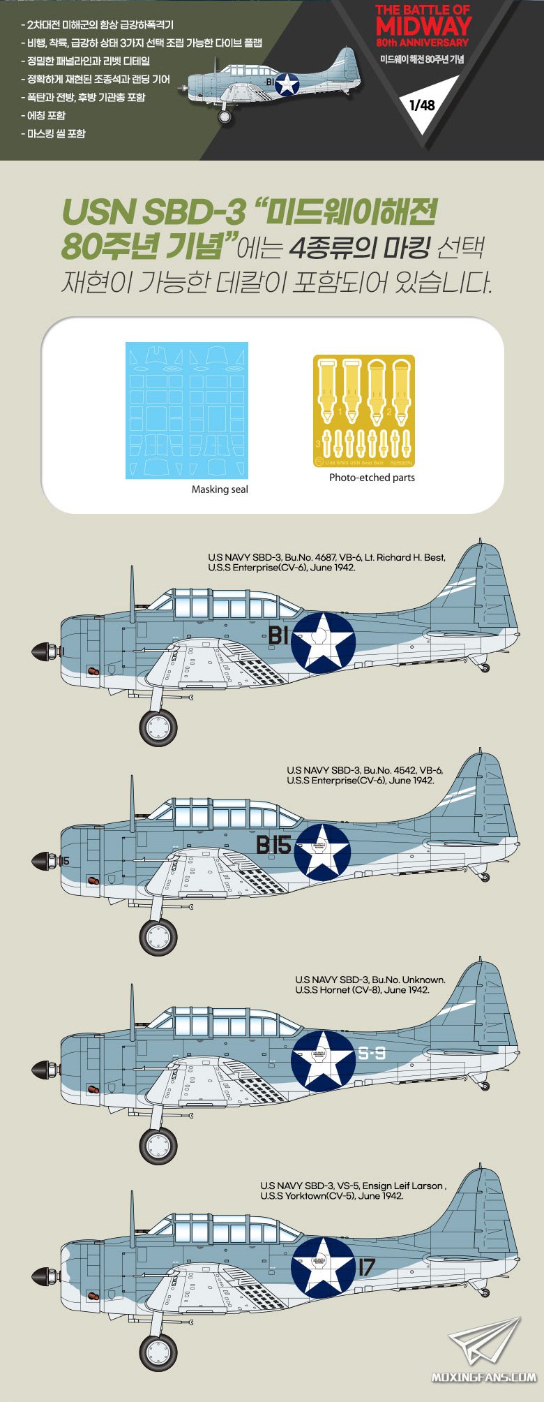 爱德美官网发布了一款新品:1/48比例的SBD-3俯冲轰炸机,提供的是中途岛海战的涂装。板件依旧是来自于爱德美收购的精准模型的模具,配有驾驶舱遮盖纸和蚀刻片,提供4款涂装可选,目前已经上市,平均售价150元左右。