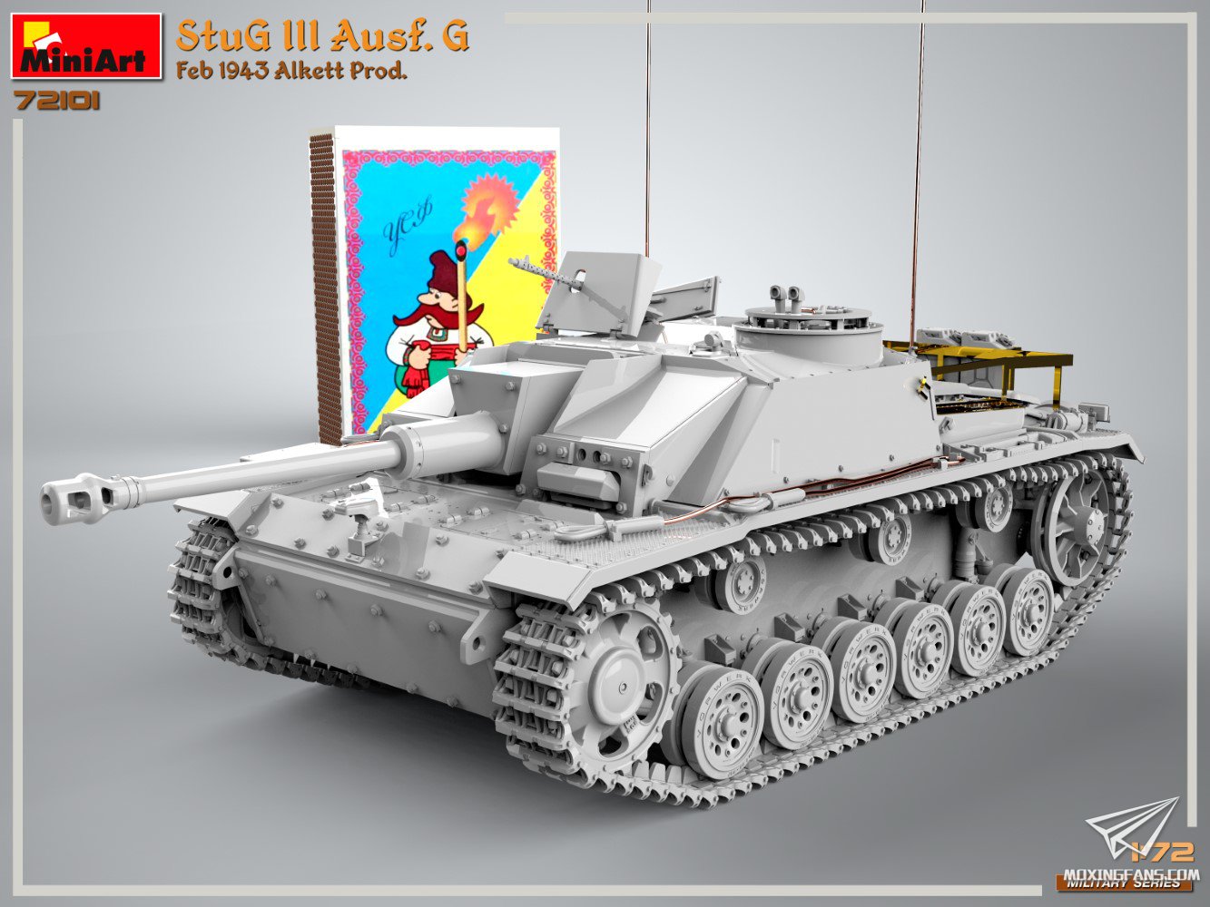 MINIART发布了一款新品:1/72比例的三号突击炮G 1943年2月 阿尔凯特生产型。这是MA旗下的第一款72比例套件,将附带蚀刻片,提供5款涂装可选。