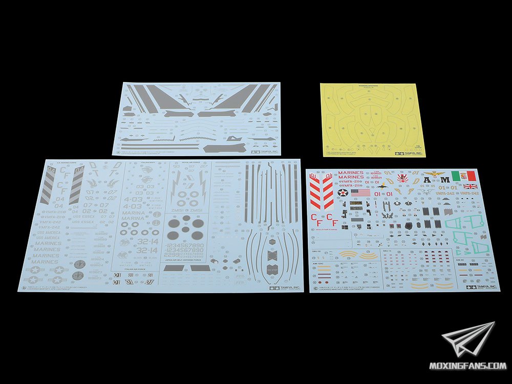 提供了3个国家共7款涂装的水贴,机体各处的小型标示水贴,还提供了座舱盖遮盖纸。