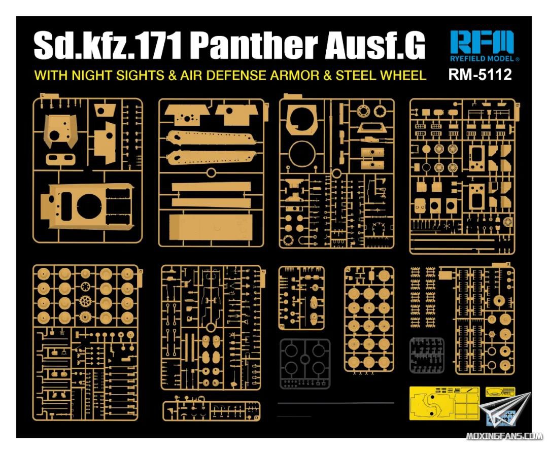 麦田模型发布了一款新品:1/35比例的豹式坦克G钢轮型附夜视仪及防空装甲。从介绍来看,这款新品相对于之前推出的豹G,附带全套的钢轮和胶轮可选,增加了夜视仪和防空装甲,附带蚀刻片和活动履带。