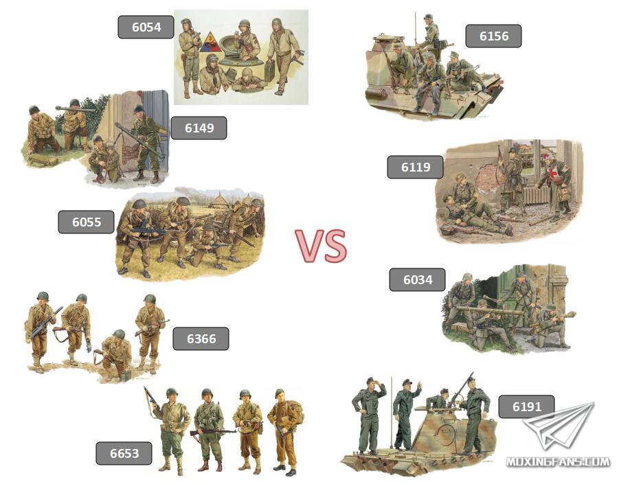6034 德国坦克猎手 6054 美国坦克车组乘员 (西北欧 1944) 6055 英联邦军队 (西北欧 1944) 6119 德国伤兵救护组 (亚琛 1944) 6149 美国陆军反坦克小组 6156 德国坦克骑兵 (洛林 1944) 6191 "注意-空袭!" 坦克车组乘员 (法国 1944) 6366 美国装甲步兵 (2代) 6653 美英盟军 (欧洲战区 1944)