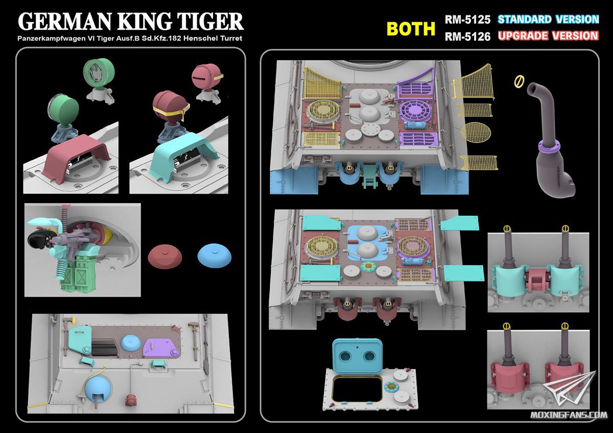 RM-5126 虎王 亨舍尔型炮塔 高配版 活动悬挂+活动履带;铝合金炮管+3D打印制退器;3D打印灭火器 、2种前照灯、6种钢缆头;随车工具两套,一套基础版一套带蚀刻件;防空装甲板蚀刻件;可拆解裙板。