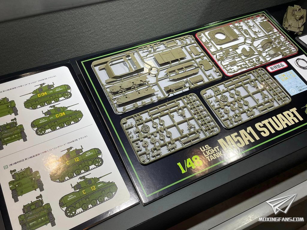 田宫正式发布了这款即将在展会上公布的1/48比例M5A1斯图亚特轻型坦克的封绘和官方成品照片。从介绍来看这款新品将附带半拼接履带和一名车长,开模比较简洁,提供2款涂装可选,2025年1月上市。