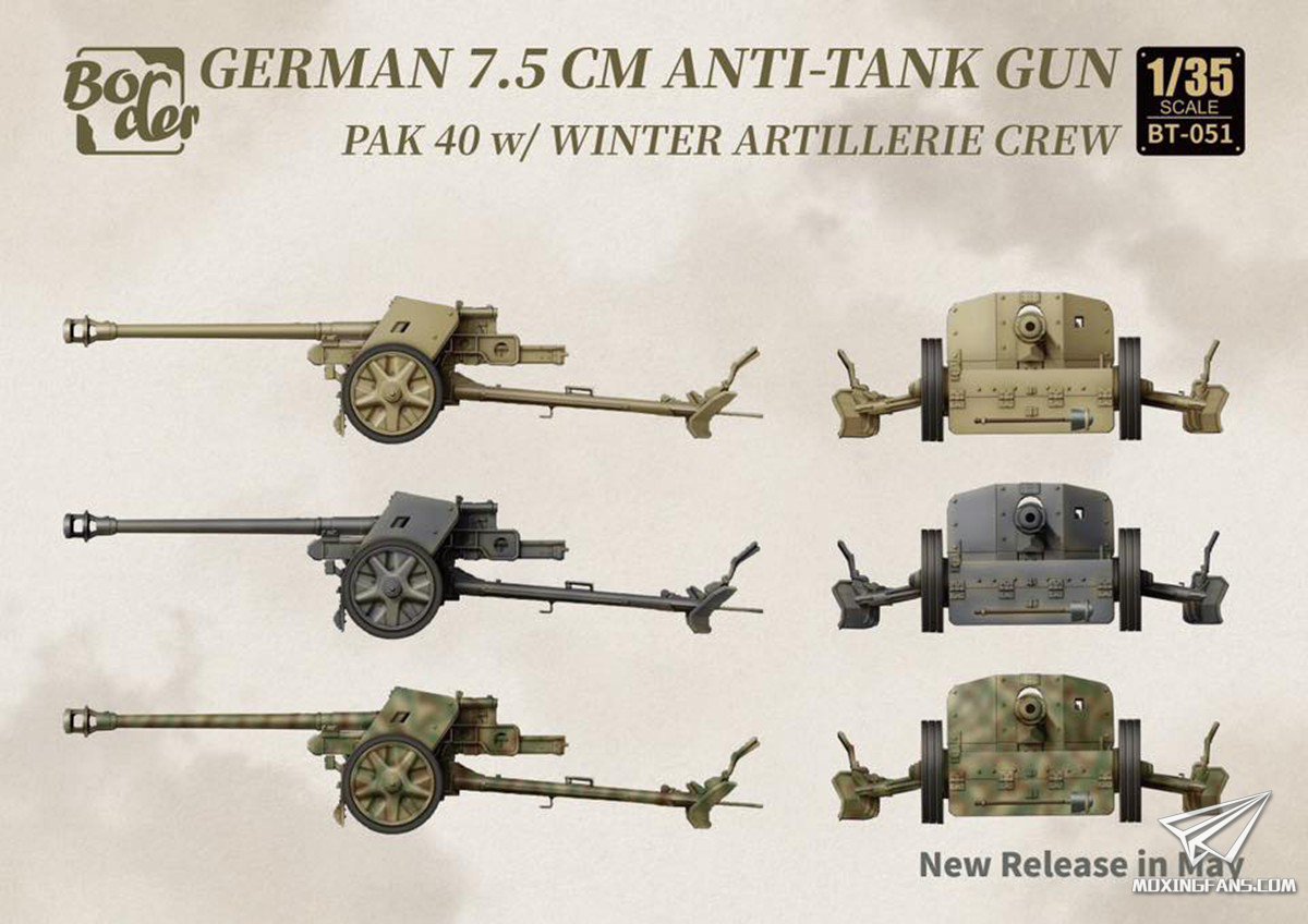 边境发布了一款新品:1/35比例的7.5cmPak40反坦克炮附冬季炮组。从介绍来看这款新品附带蚀刻片和铝合金炮管,提供多款车轮和制退器可选,提供3名冬季炮组人形,3款涂装可选,预计将于5月上市。