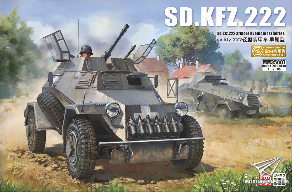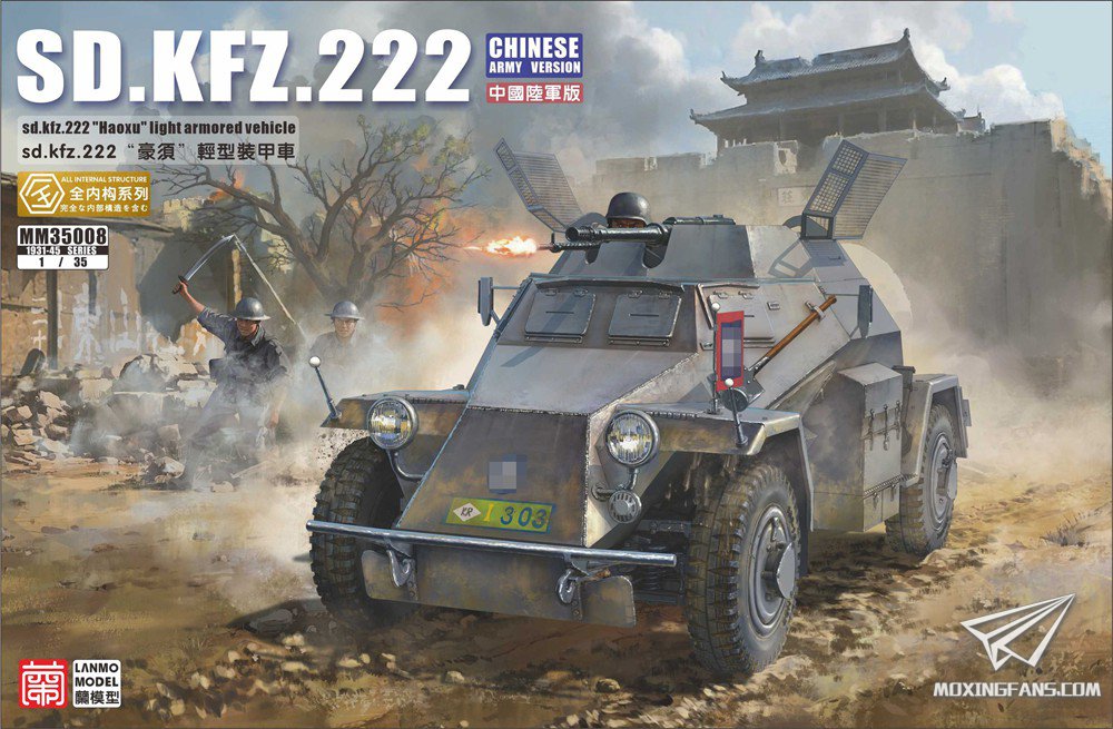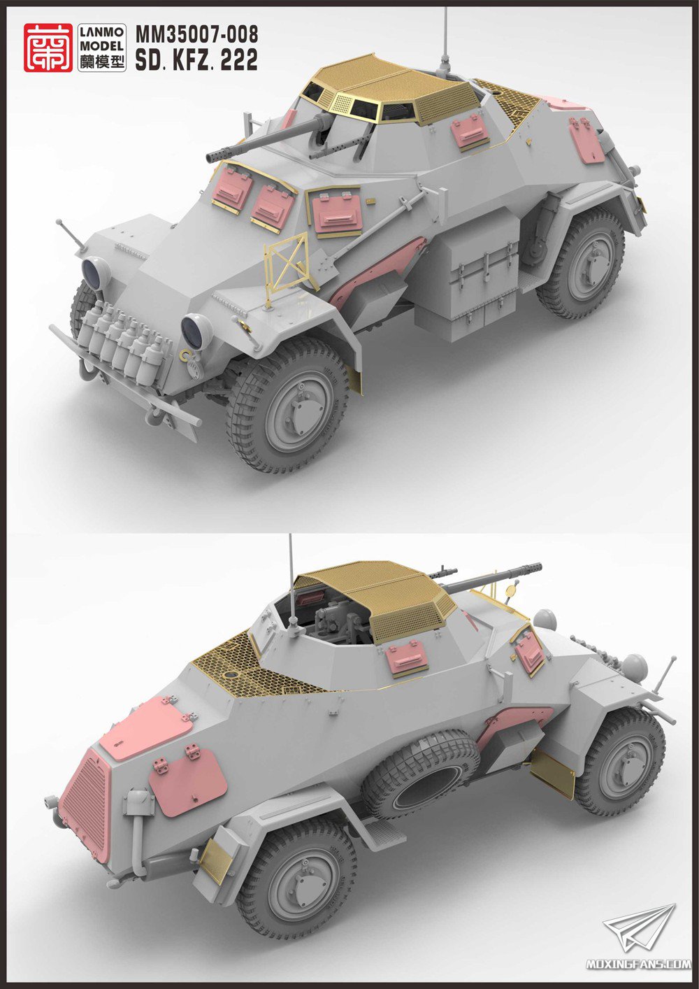 蘭模型的222装甲车装甲车有新消息了,这次发布的共2款,分别是德国早期型和中国型,厂家介绍如下: 全新sd.kfz.222 装甲车进行更为精细的考证及细节: 1,完善发动机及变速箱系统,包括早中期和晚期的不同区别介绍。 2,活动悬挂系统区别,以及早中期A型底盘和晚期B型底盘区别。 3,包括区别于晚期的左侧扭杆系统。并且还原车身框架系统分离。 4,增加了活动炮架及脚踏开火系统,全活动舱门,活动悬挂。 5,对各种版本的车体进行了更细节的考证。(参考NUTS BOLTS 47 超级经典的考证书籍,建议购买) 6,包括对二战中国陆军版详细车体及外部迷彩考证(在此感谢来自澳门的曾健國先生的资料以及书籍:中国武侑圖誌) 7,并且会继续采用非免胶但分色板件。 8,可能预计12月份现货上市!