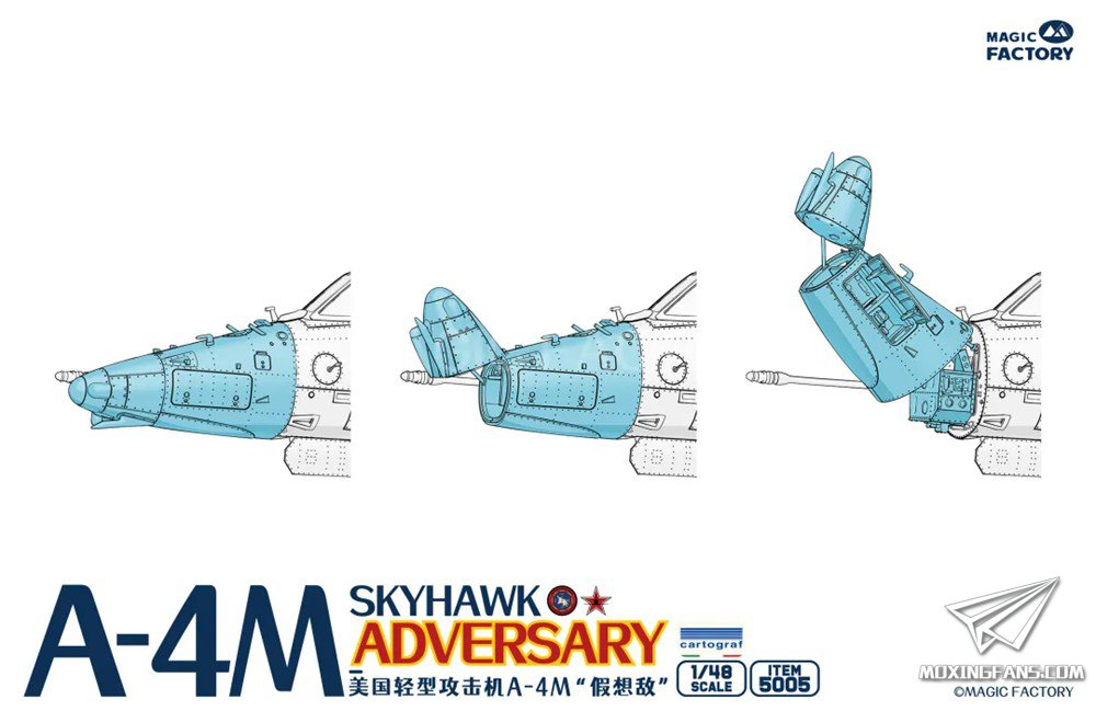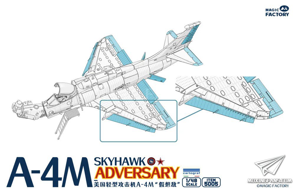 魔力工厂预告了一款新品:1/48比例的A-4M天鹰攻击机假想敌涂装。这款新品跟之前的天鹰最明显的区别就是涂装,提供了2款假想敌涂装,附带蚀刻片和金属空速管,官价258元。