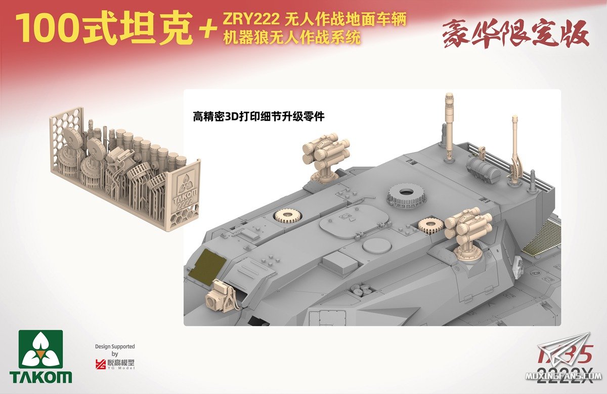 2222X:1/35 ZTZ-100主战坦克豪华限定版 舱门可制作成打开或关闭状态;附带蚀刻片和透明件;可动悬挂;可动路轮;可动履带;附带3D打印零件;附带数码迷彩遮盖纸;2款涂装可选。 包含ZRY222无人作战地面车辆和3只机器狼无人作战系统。