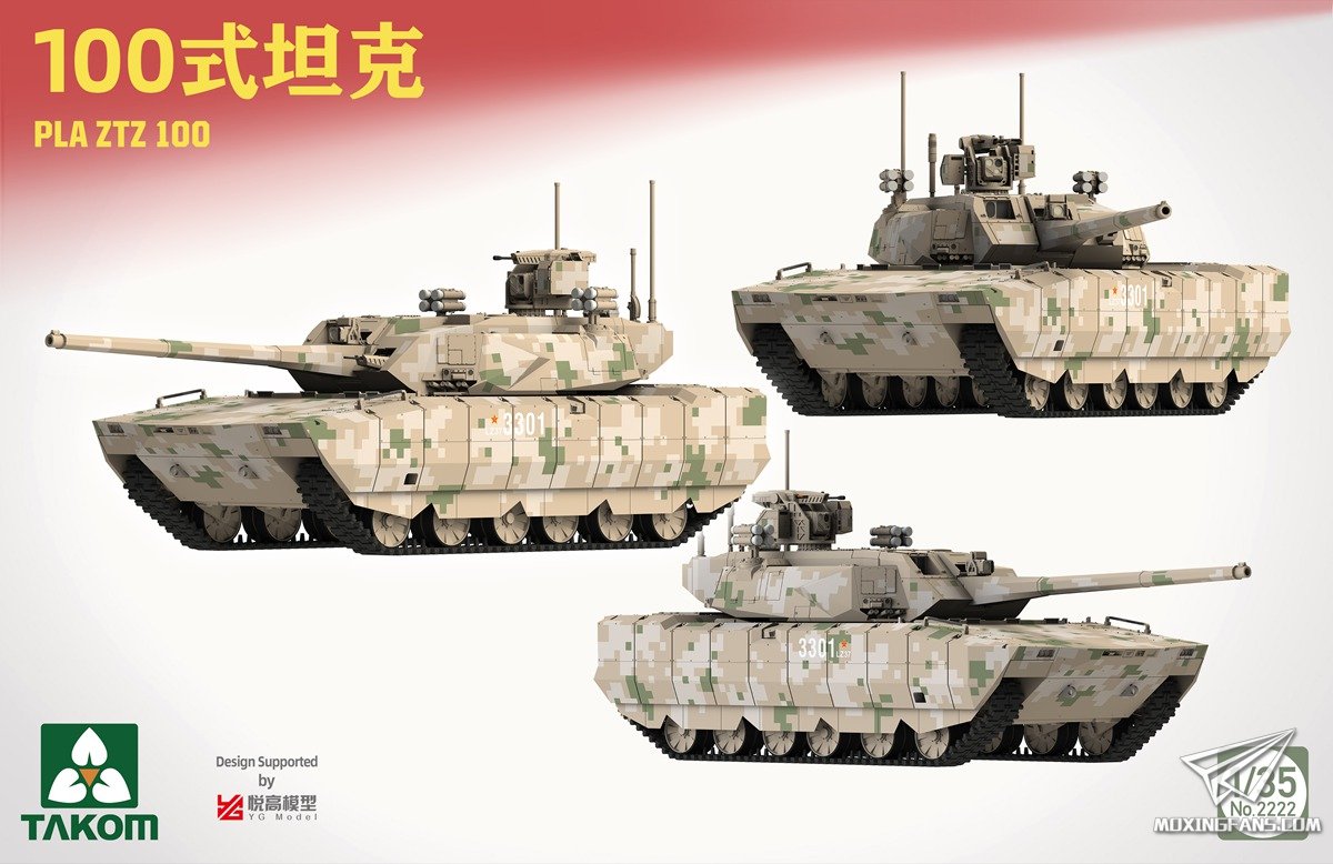 2222:1/35 ZTZ-100主战坦克 舱门可制作成打开或关闭状态;附带蚀刻片和透明件;可动悬挂;可动路轮;可动履带;2款涂装可选。