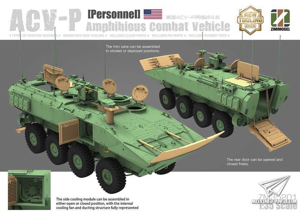 ZIMI模型预告了一款新品:1/35比例的ACV-P两栖战斗车。ZIMI介绍:本套模型在设计阶段即以“高还原度 + 高完成度 + 良好制作体验”为核心目标,采用了大量先进注塑开模技术,包括多方向滑块结构与合理的零件拆分方式。上市时间未公布。