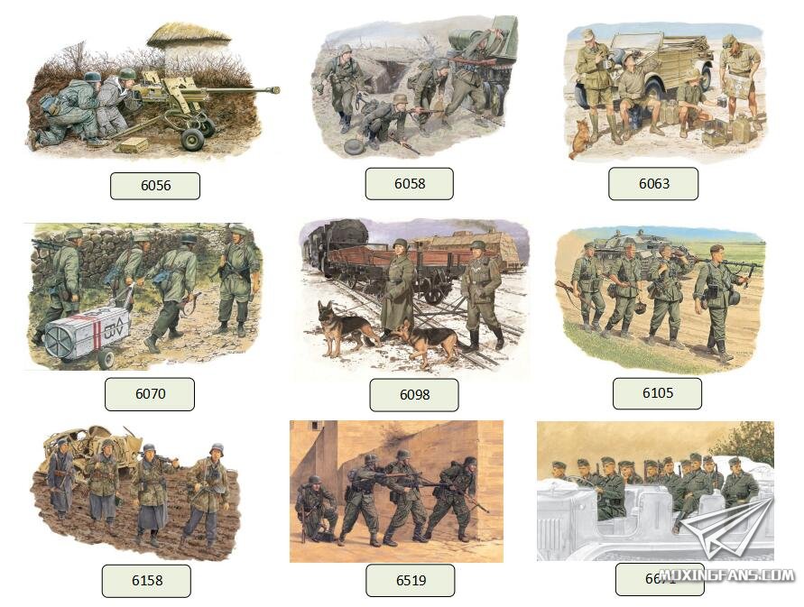 威龙的1/35比例模型套件系列中包括了丰富的二战德国士兵模型。我们精选了几款经典套件进行再版,展示了来自不同部队的士兵,如反坦克部队、空降猎兵、野战宪兵和步兵,每个士兵都穿着各自独特的制服。这些多样化的兵人激发了模型制作者的场景创作灵感。
