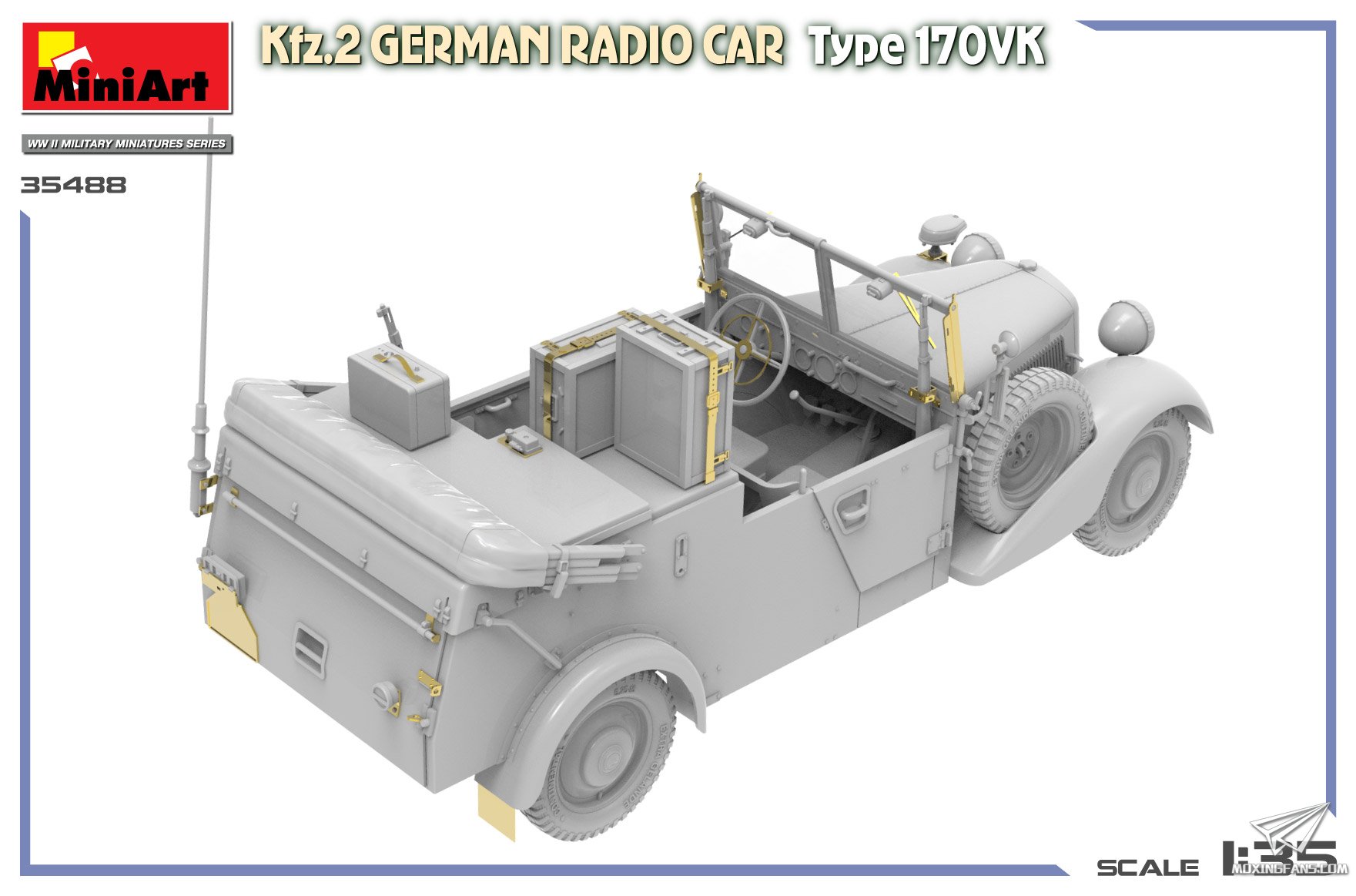 MINIART预告了一款新品:1/35比例的Kfz.2 170VK型通信车。从介绍来看,这款新品附带蚀刻片,车厢内增设了大型电台和天线,将于近期上市。