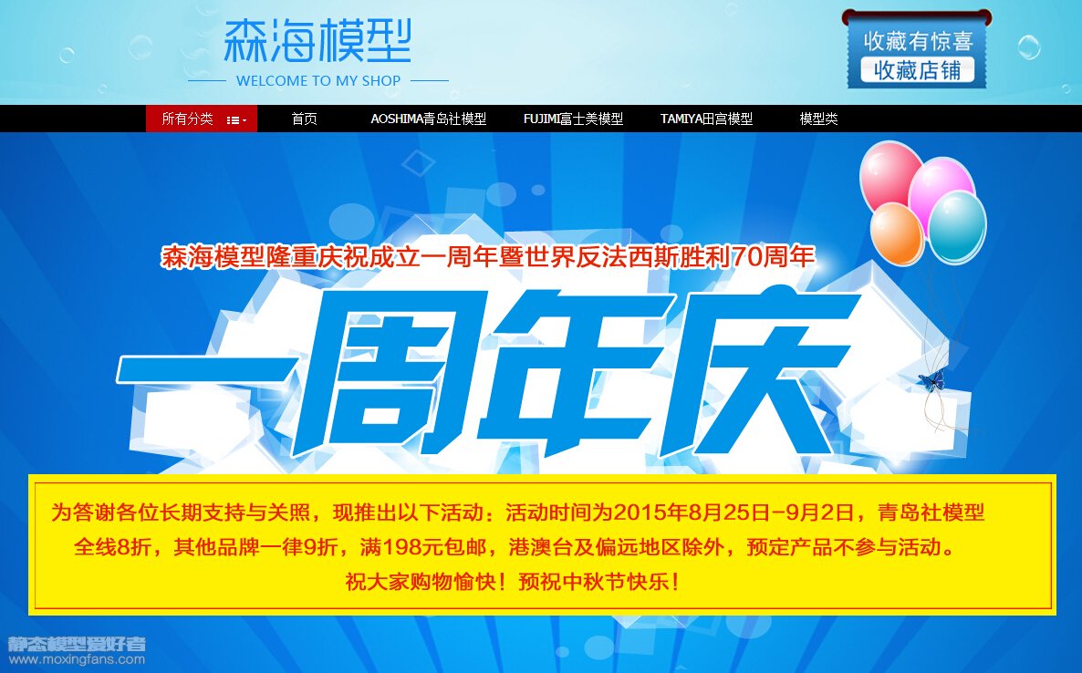 随着阅兵日的到来,各大模型厂家也逐步开始了打折的活动,森海模型就首先开动了。为庆祝森海模型开业一周年和反法西斯战争胜利70周年,森海模型店中青岛社模型全线8折,其他品牌9折,满198元包邮大多数地区,活动截止到9月2日。森海模型是以舰船类模型为主的模型店,店中商品的价格还是很厚道的,打折后就更超值了,推荐船党选购,而且其店中的TASCA也参与打折,折后的价格甚至比思高还要便宜,馒头党不可错过! 小编会继续推荐近期打折优惠的模型店家,请大家继续关注小站!
