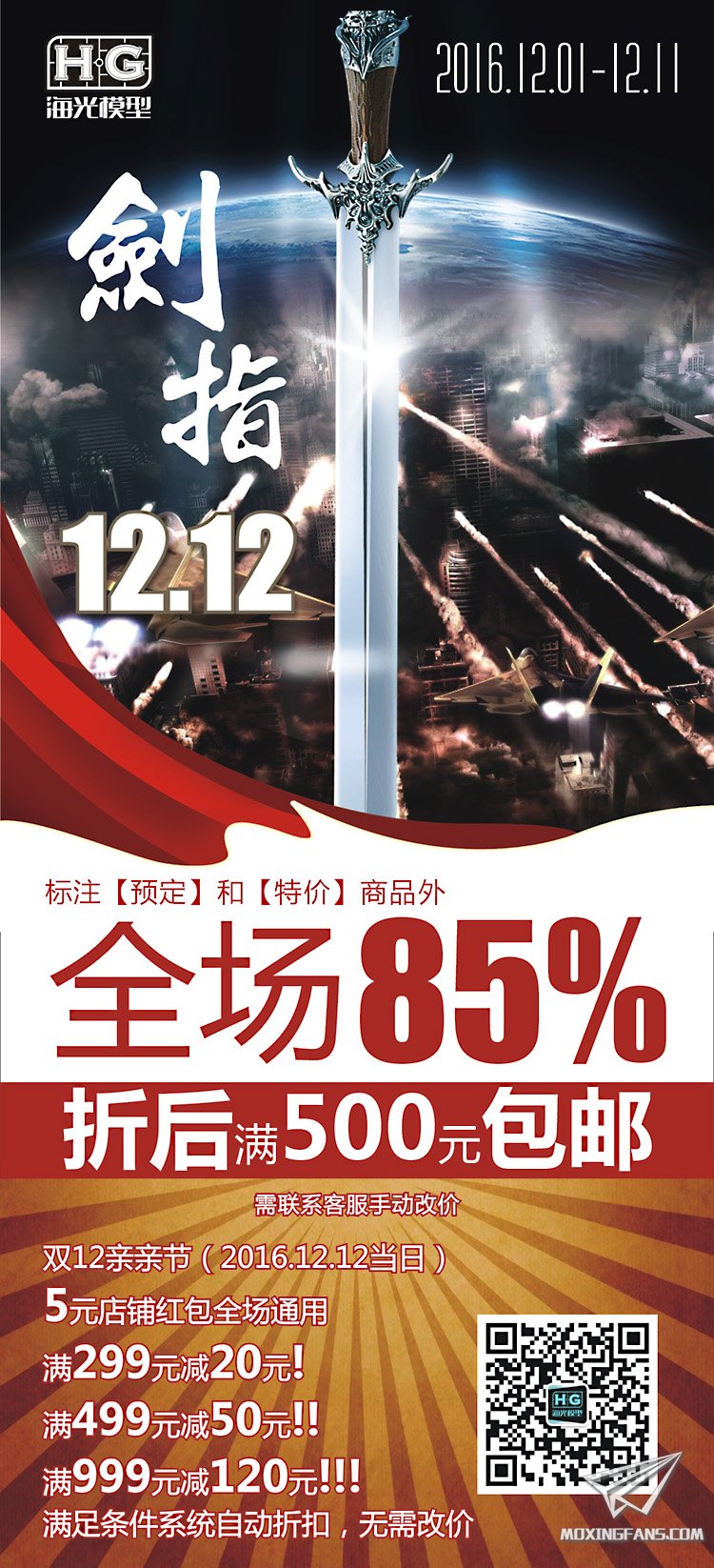 ↑↑↑点击上方传送门直达↑↑↑ 苏州海光模型双十二活动已经开始,12月1日-12月11日,除预定和特价商品外,全场85折,折后满500包邮,需联系客服手动改价。12月12日当天,店铺提供5元红包,满299减20,满499减50,满999减120。小编目测店内还有不少好东西,有看上的模友不要放过,如果等到1212当天恐怕好货就不多了。