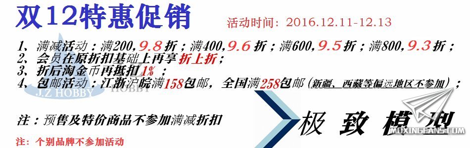 南京极致模型双十二活动开始,12月11日-12月13日,满200打98折,满400打96折,满600打95折,满800打93折,满减折扣可叠加会员折扣享受折上折。折后还可叠加淘金币优惠1%。江浙沪皖满158元包邮,其他大部分地区满258元包邮。