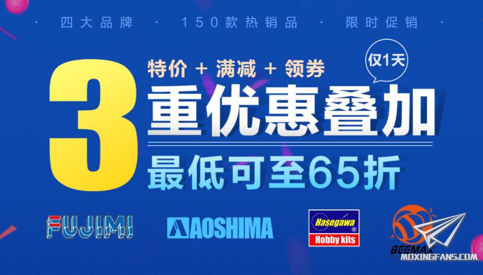 3G模型新开了一个特价专区,其内包含富士美,青岛社和长谷川等多个品牌的模型,全部特价。另外,喜闻乐见的整点秒杀活动也开始预告了,定好闹钟吧。