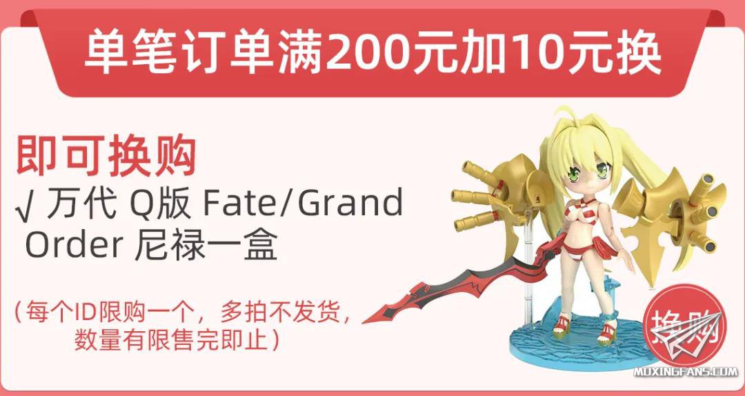 还有还有,活动期间单笔订单满200元加10元即可换购万代Q版尼禄一盒,简直是不能再优惠了!