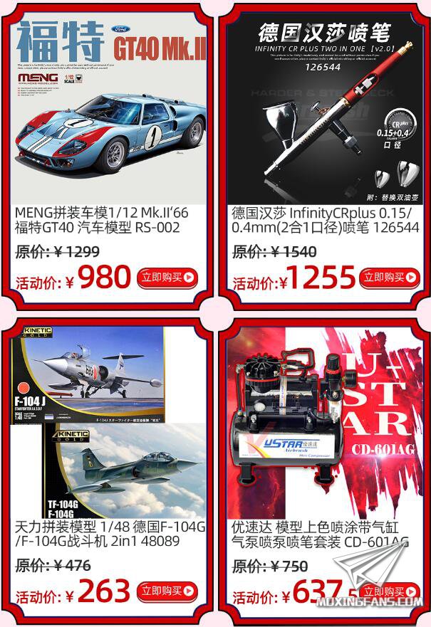 2,英利模型:传送门 天力1/48 日本&德国 F-104J&F-104G / InfinityCRplus 0.15/0.4mm喷笔 天力的F-104系列是2019年新开模的套件,是天力当时的重量级产品,采用最新的考证资料开模,钉线锐利,配有蚀刻片和C社水贴,被天力划归为“金牌套件”系列寄予厚望。然而200+那过于高昂的售价却极大的限制了销量,再加上市面上大量100出头的长谷川F-104的打压,让这个系列成为叫好不叫座的代表。对于F-104这种满身铆钉亮光闪闪的飞机小编一直都是没有抵抗力的,这次双机套装满减后仅售263,相当于原价的5.5折,实在没有不掏钱的理由。 汉莎的Infinity系列喷笔一直都是居于模型喷笔行业顶端的存在,凭借华丽的外观设计和优秀的喷涂性能一直都让人欲罢不能,拿在手上就宛如一件工艺品的存在,不得不赞叹德国人的工业设计能力。作为汉莎喷笔家族王冠上的宝石,这次英利的InfinityCRplus 0.15/0.4mm二合一喷笔满减后仅售1255元,也是相当有吸引力了。要知道这支喷笔附带0.15和0.4两套喷针和喷嘴,可以替换使用,相当于一支喷笔的价格买2只不同口径的喷笔,性价比还是非常出色的。