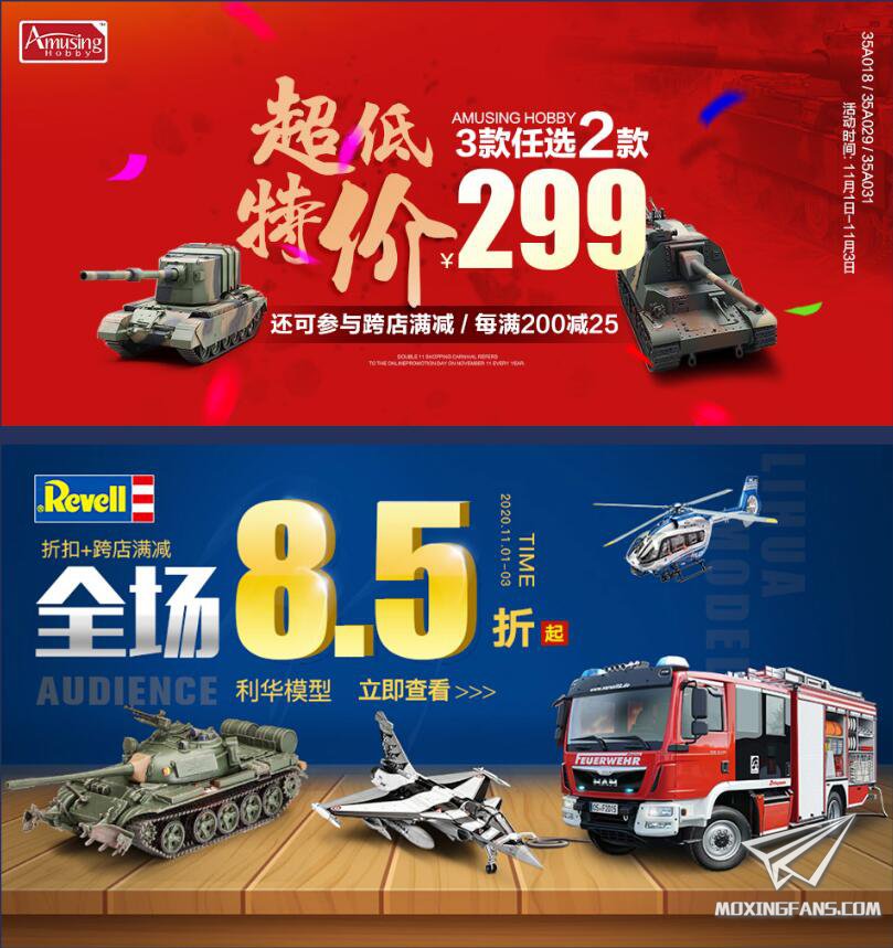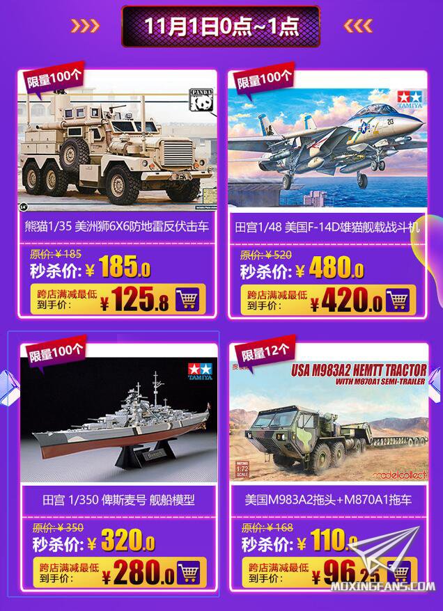 明天是11月1日,是某宝双十一购物节优惠活动开始的日子,为期三天。各大商家这次看上去干劲十足,推出了不少的优惠活动,下面就跟小编一起来看一下明天有什么好货值得买。 1,恒辉模型:传送门 田宫 61118 1/48 美国F-14D雄猫战斗机 毫无疑问,田宫的F-14杰作机系列是这个题材公认的最佳选择,凹钉凹线,细节锐利,组合完美,唯独一个槽点:贵!最近几年因为汇率等原因的影响,田宫的热门套件价格一涨再涨,但是这次F-14D叠加满减之后420的价格还是非常有诚意的。当初小编在2018年的时候是430+的价格入手,这几年就鲜见比这个价格低的时候,没有入手过的模友强烈推荐。注:11月1日0-1点开启抢购,限量100个,为了这个熬一下夜小编觉得还是值得的。