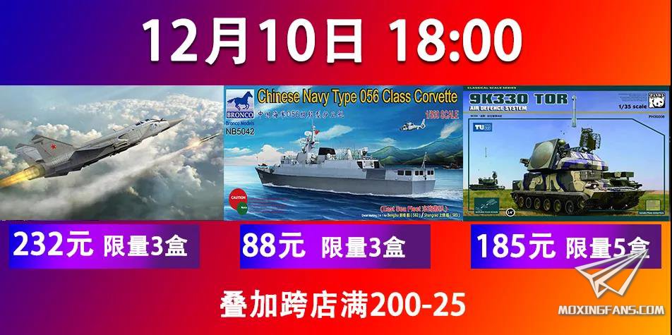 海光模型的双十二活动将于今晚开始,满200减25,满额有赠品,此外还推出了一系列的秒杀活动,模友们有看中的可以先加购物车。