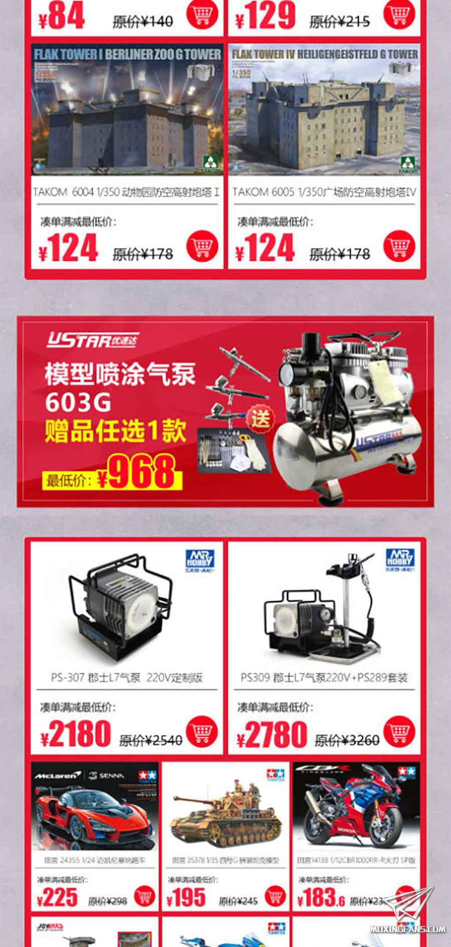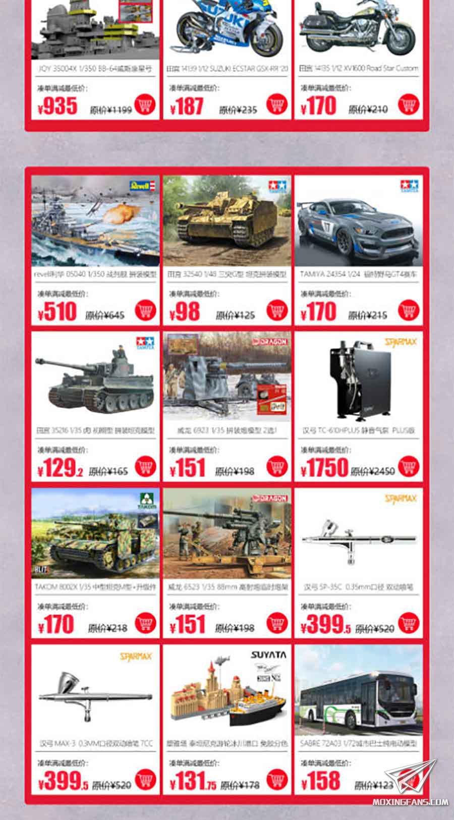 昨天下午,不知什么原因,恒辉模型的手机端首页更新成了双十一的促销页面。虽然恒辉很快就发现了问题换回了正常的页面,但是还是有不少眼疾手快的模友截了图。虽然这个页面不一定是双十一的正式页面,但是这个页面还是很有一些价值的,不少模型的价格很吸引人,你准备买哪些呢? 恒辉模型