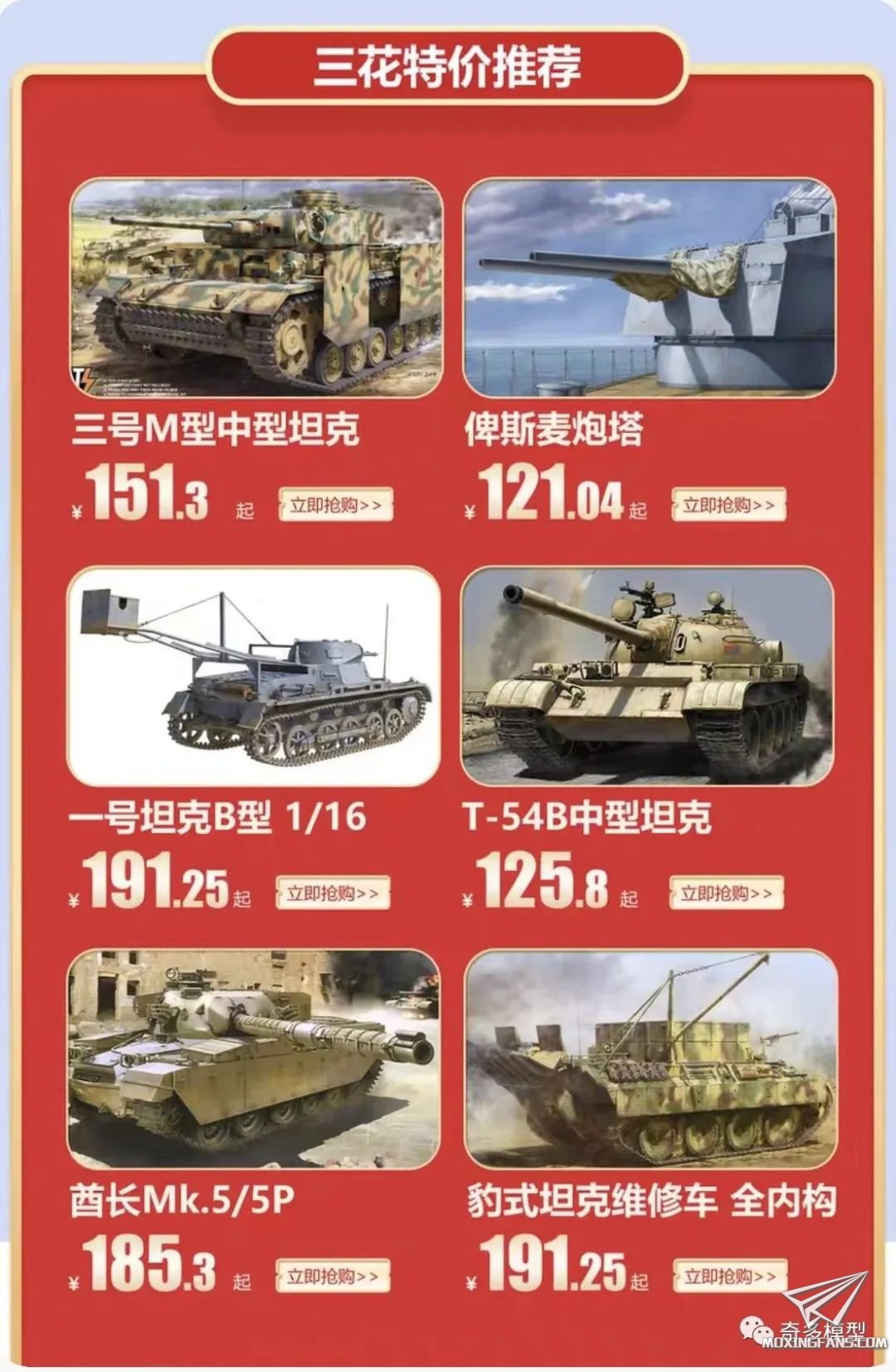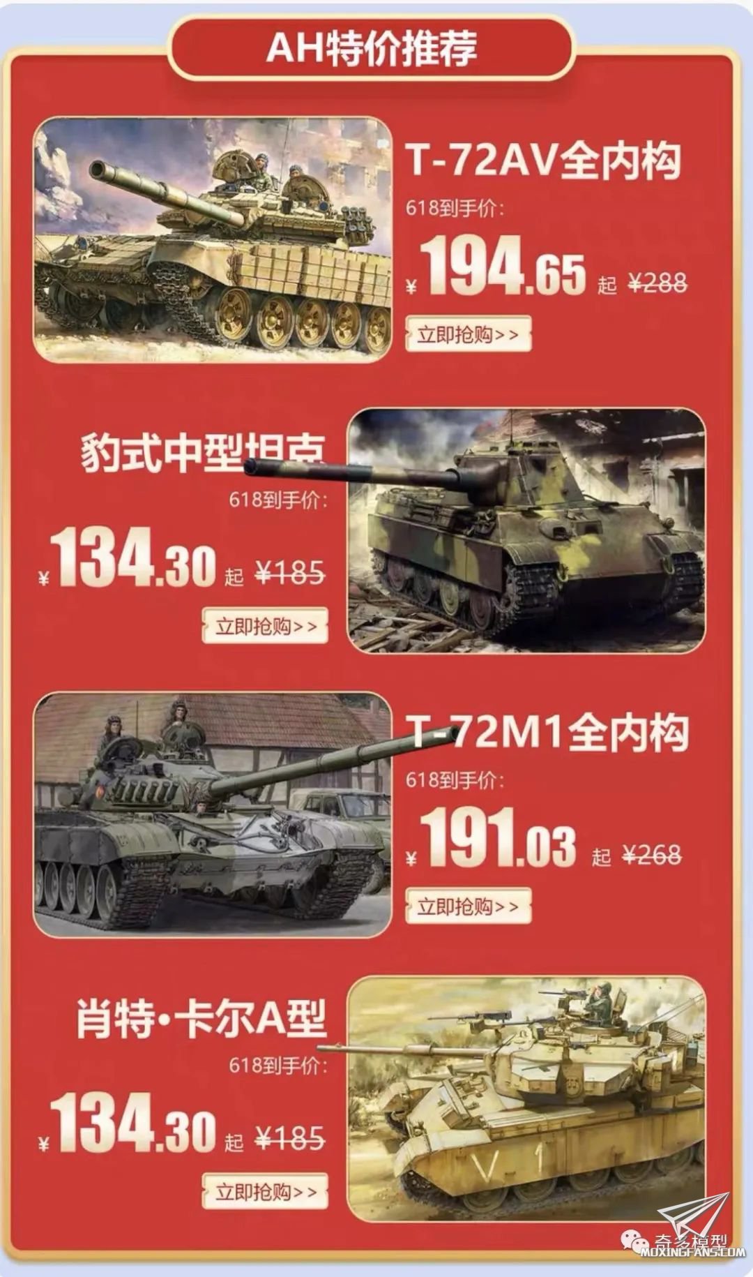 跨店满200减30,满额赠礼,此外还有多款品牌特价,其中VOIIO的M1,AH的两款T-72,MENG的Z4,酋长和猎豹价格都不错,上次没抢到的这次可以下手了。