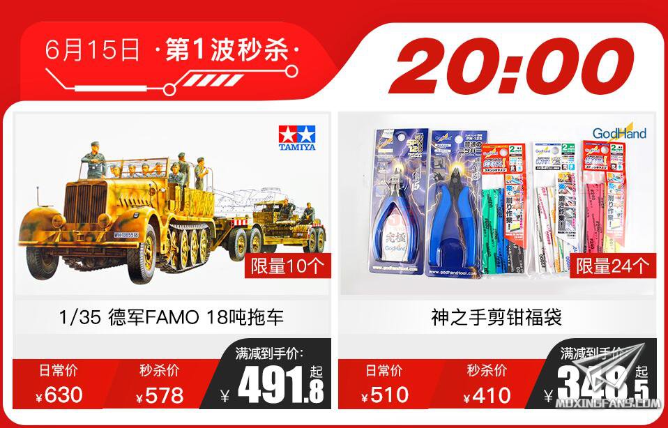 全店满200减30,三花的新品和到货比较值得关注,此外前4小时的特价产品也值得关注,比如神之手SPN-120,田宫杜卡迪帕尼加尔V4等基本都是全网最低了。