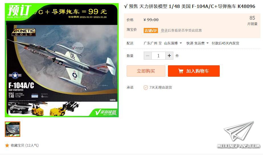 天力的F-104A/C特价中,现在购买还赠送导弹挂载车,仅需99元。天力的F-104属于黑金系列,整体素质挺不错,小编之前还做过开盒评测,喜欢飞机的模友不要错过。
