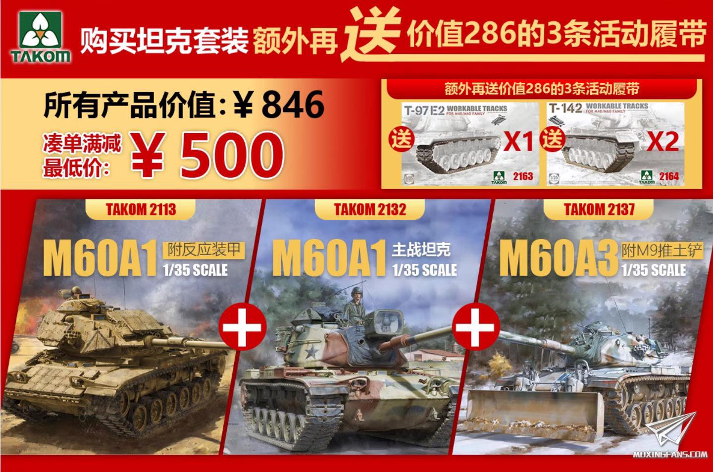 | 今年的双十一比往年来的更早,咱们就来捋一捋这个双十一有哪些官降和新品值得入手吧。定价方面以某宝价格为准,只要合理凑单大家最终的到手价应该都是不高于这个价格的。 1,首先来看官降,三花这个双十一拿出了三款M60打包出售,分别是带附加装甲的A1,光板A1和A3共3款,都是在2018到2021年推出的。市面上其他厂家的M60其实有不少,AFV的M60也很能打,细节方面表现非常出色,但是配置方面却比较寒酸,只给出了蚀刻片和金属炮口,履带还算软胶的,而售价却要300多,性价比并不高。三花的这三款M60打包,初上市时单价在200左右,附带蚀刻片和软胶履带。如今三盒打包,凑单后只要500,而且还赠送3套三花原装的活动履带,弥补了履带方面的缺憾,核算下来每盒只要166,相当于只要59折左右。