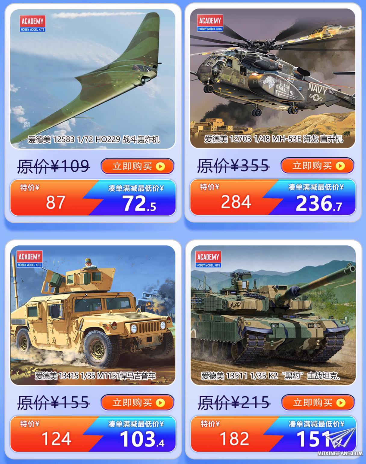 3,然后来看爱德美,首先是35比例的AH-1Z蝰蛇。这款蝰蛇是爱德美2019年的重量级产品,全机凸钉细凹线设计,C社水贴,细节表现出色,组合度也不错,是这个题材的决定版,这次合理凑单后只需150+,算是历史新低了,想要玩一下35比例直升机的话爱德美的这款强烈推荐。 另外一款是48比例的阵风C,这架飞机并不是爱德美开模,而是使用了利华的板件,细节非常棒,虽然组合度较为一般,有几条缝隙需要填补,但是依旧是阵风C的决定版,这次合理凑单后只要120+,也是历史低价了。其余的M1151悍马和K2黑豹也不错,可以放心买。