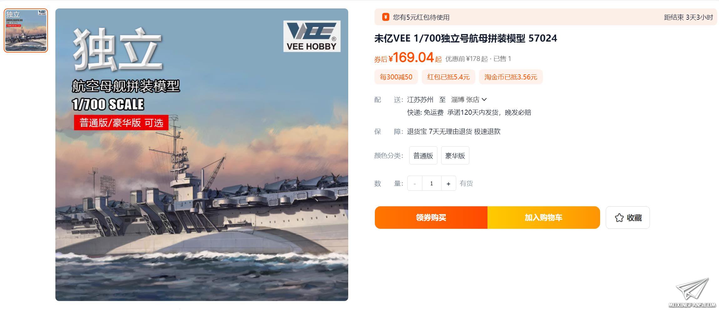 3,未亿模型的700比例独立号航母预售了,分为普通版和豪华版,普通版没有蚀刻片,豪华版有蚀刻片,金属件,金属锚链和甲板遮盖纸,凑单后的价格分别是140+和250+。