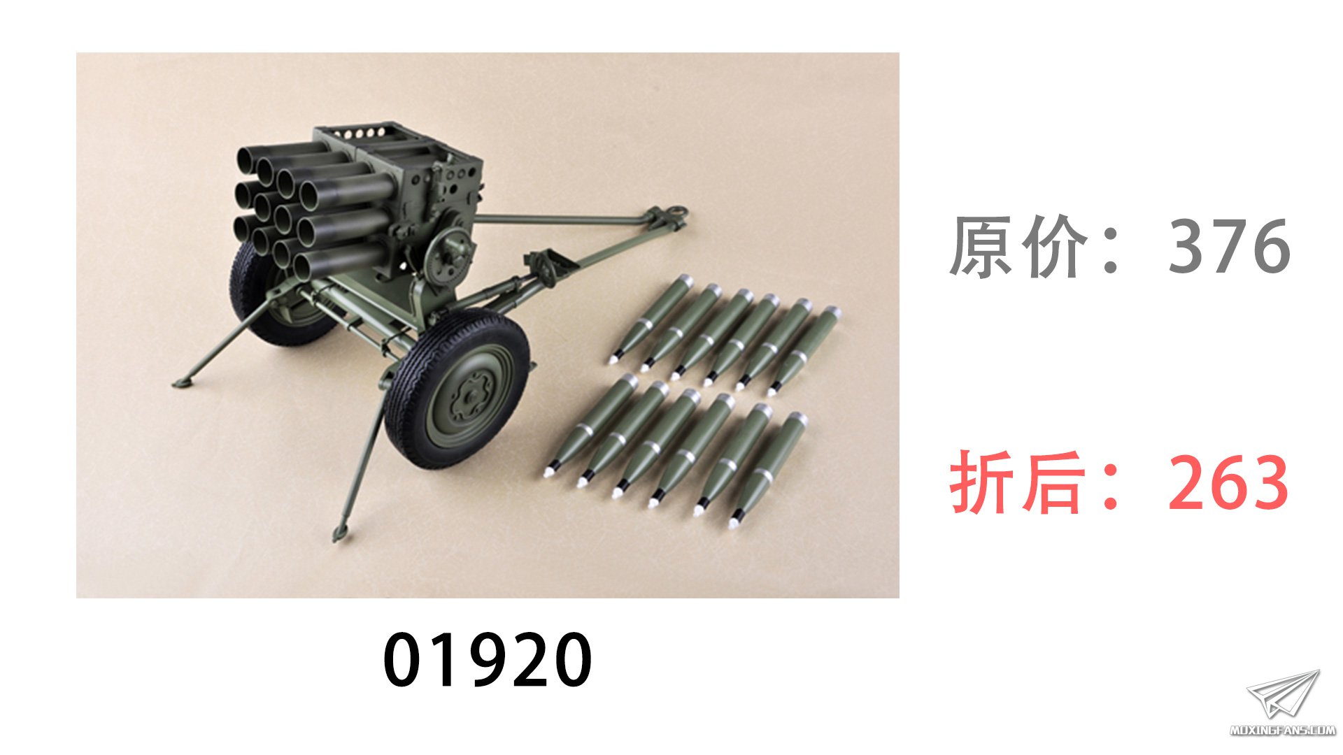 1,63式107毫米牵引式火箭炮。这款火箭炮就是大名鼎鼎的107火,被全世界称为游击战神器。乍一看小号手的这款107火平平无奇,但是仔细一看就发现端倪,这是一款1/6的套件,成品的长度足足半米,满足各种大平层模友体积控的需求。火箭炮模型最头疼的发射管也不用担心,小号手简单粗暴的给了12根薄壁金属管,什么无缝,什么打磨,简直弱爆了。相对于模友们自己制作收藏,这款模型更加适合送礼,原价376元,特价263元。