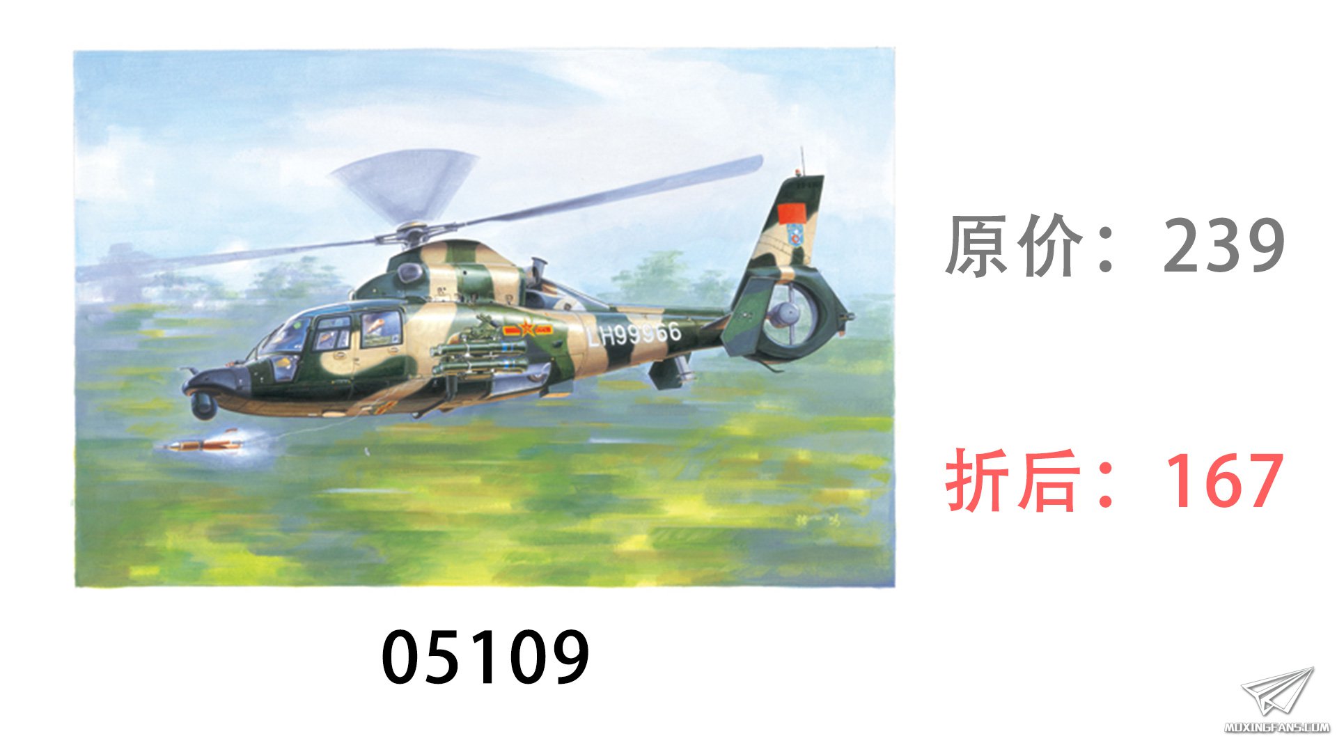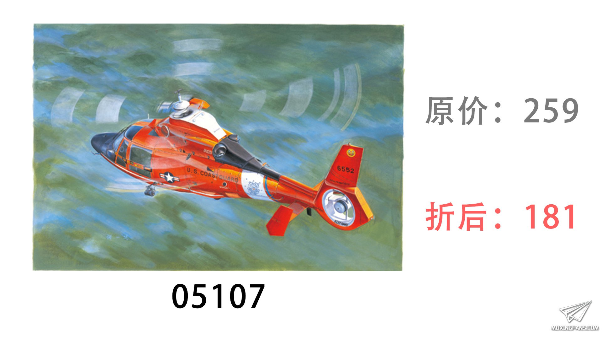 2,这几年比较流行35比例的直升机,其实小号手10年前就已经推出了不少套件了。这款35比例的直-9WA就是其中之一,2015年上市,受年代所限,机身表面采用了凹钉凹线的设计,而且钉子的数量并不多,只有舱门附近的寥寥几个,需要动手增加一些铆钉才对得起35的比例,配置方面也只给了2小张蚀刻片。然而35比例直升机的体积优势还在,虽然直-9并不大,模型化之后的长度也来到了30厘米左右,再加上题材的加持和亲民的售价,性价比还是不错的,原价239元,特价167元。单子里还有一款跟直-9系出同门的美国救援海豚,价格稍贵,原价259元,特价181元。