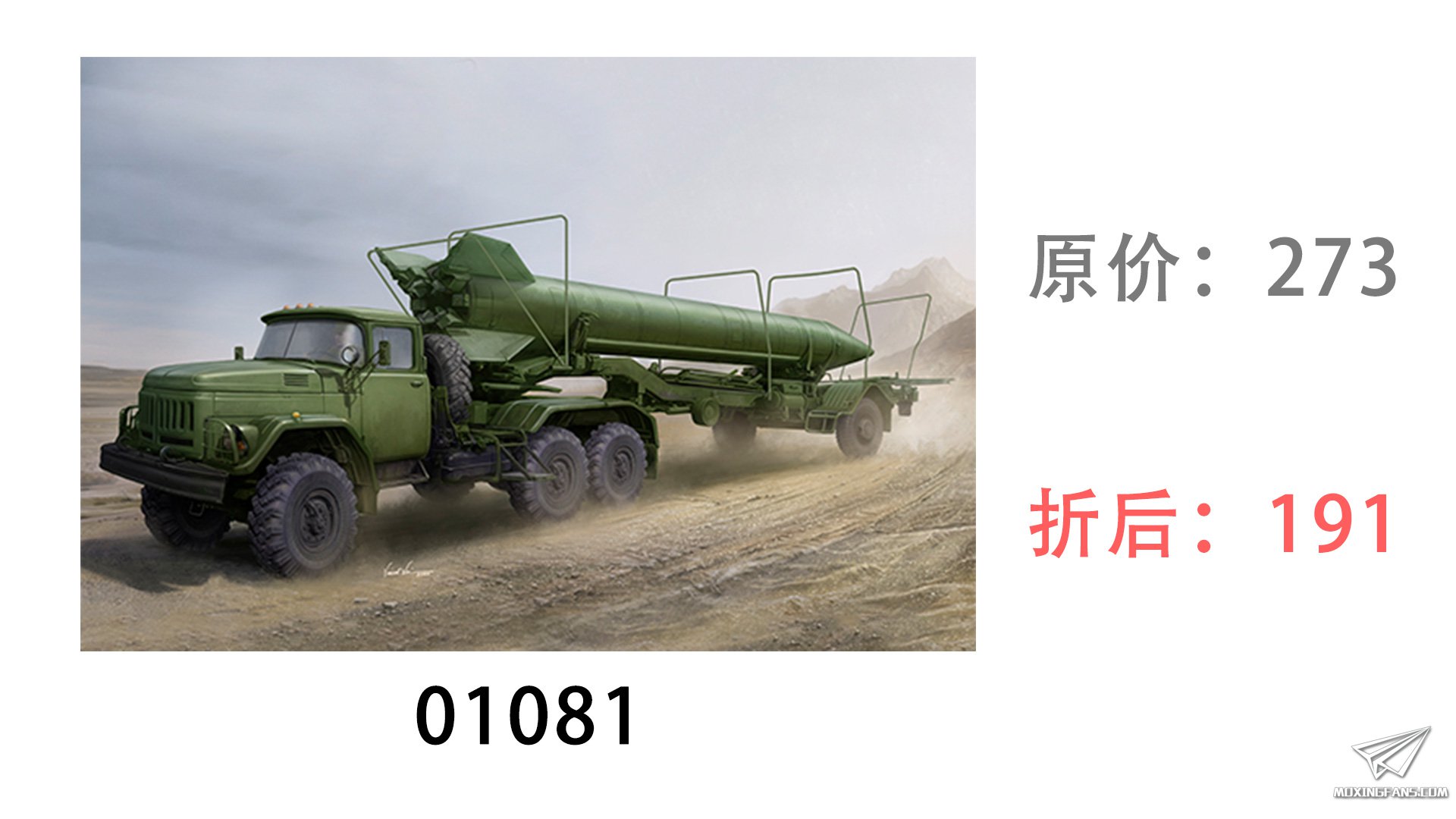 3,Zil-131V牵引车&8K14导弹。Zil-131V是Zil-151的后续型号,它牵引的导弹就是大名鼎鼎的飞毛腿B,如果放在二战时期这辆车就是飞毛腿弹药车。这款套件2021年上市,也是以体积见长的,成品的长度达到了40多厘米,附带蚀刻片和软胶轮胎。小号手的这盒套件虽然上市已经有几年了,但是一直没有见到成品,这里就放几张Zil-131V牵引萨姆2导弹的成品照片大家参考一下,原价273元,现价191元。