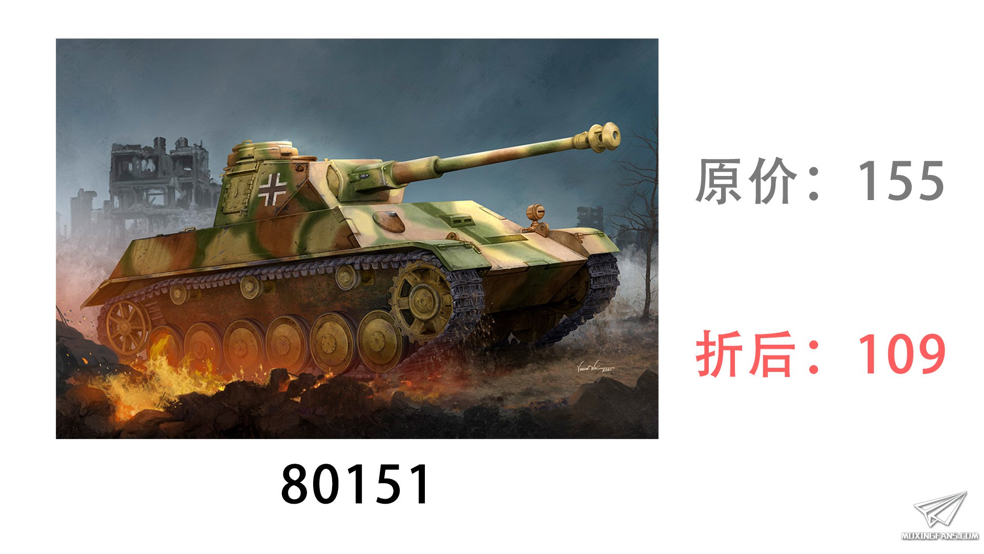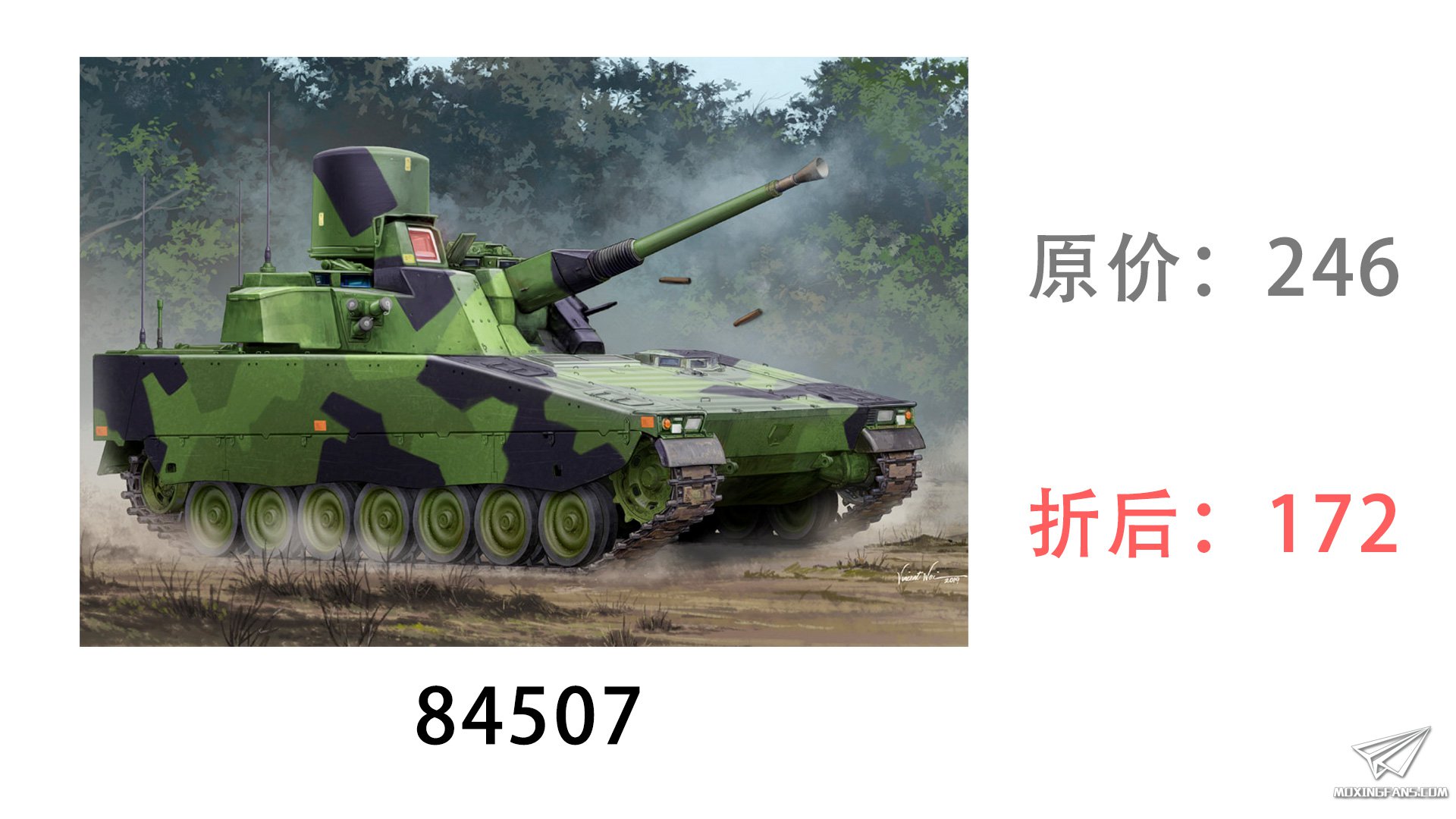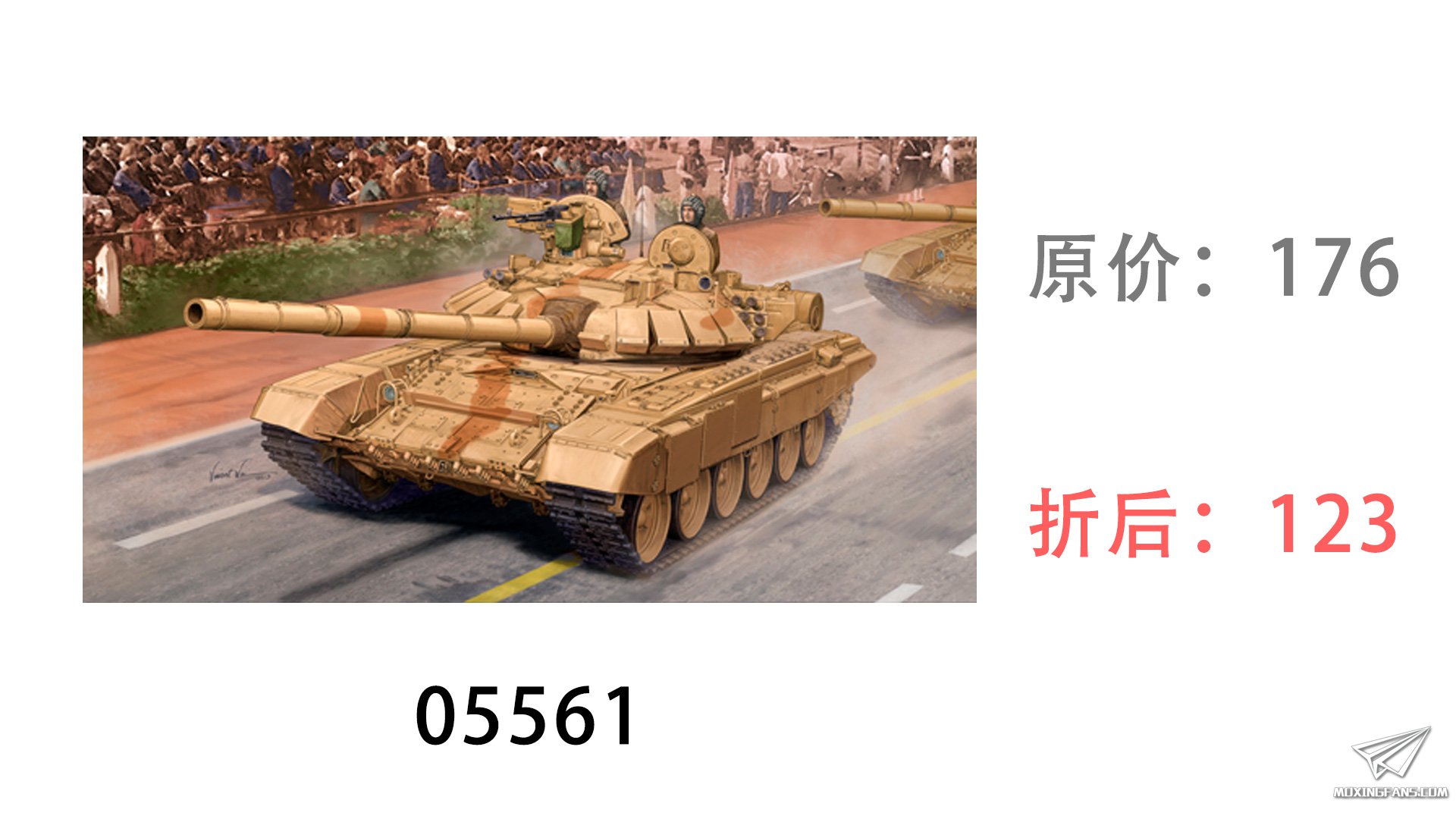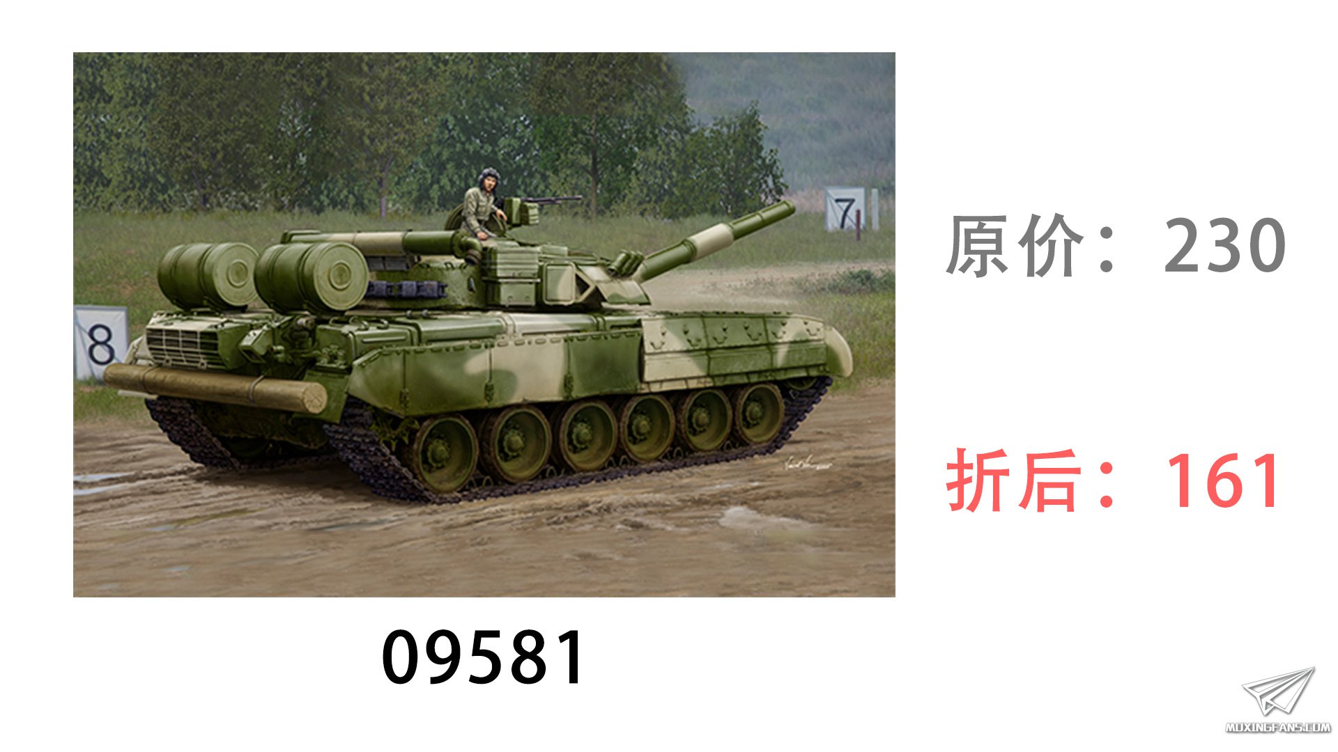 6,T-80UD主战坦克早期型。小编前段时间分别制作了小号手的T-80BVD和麦田的T-80U,总体感受不管是细节还是配置小号手是比不上麦田的。但是小号手毕竟是大厂,衍生型号非常丰富,这款T-80UD就属于小号手的独占题材,适合喜欢UD这个型号的模友。T-80UD相对于T-80U最明显的区别是使用了柴油机而非燃气轮机,在外观方面很容易区分。这盒套件2021年上市,附带蚀刻片和拼接履带,原价230元,现价161元。