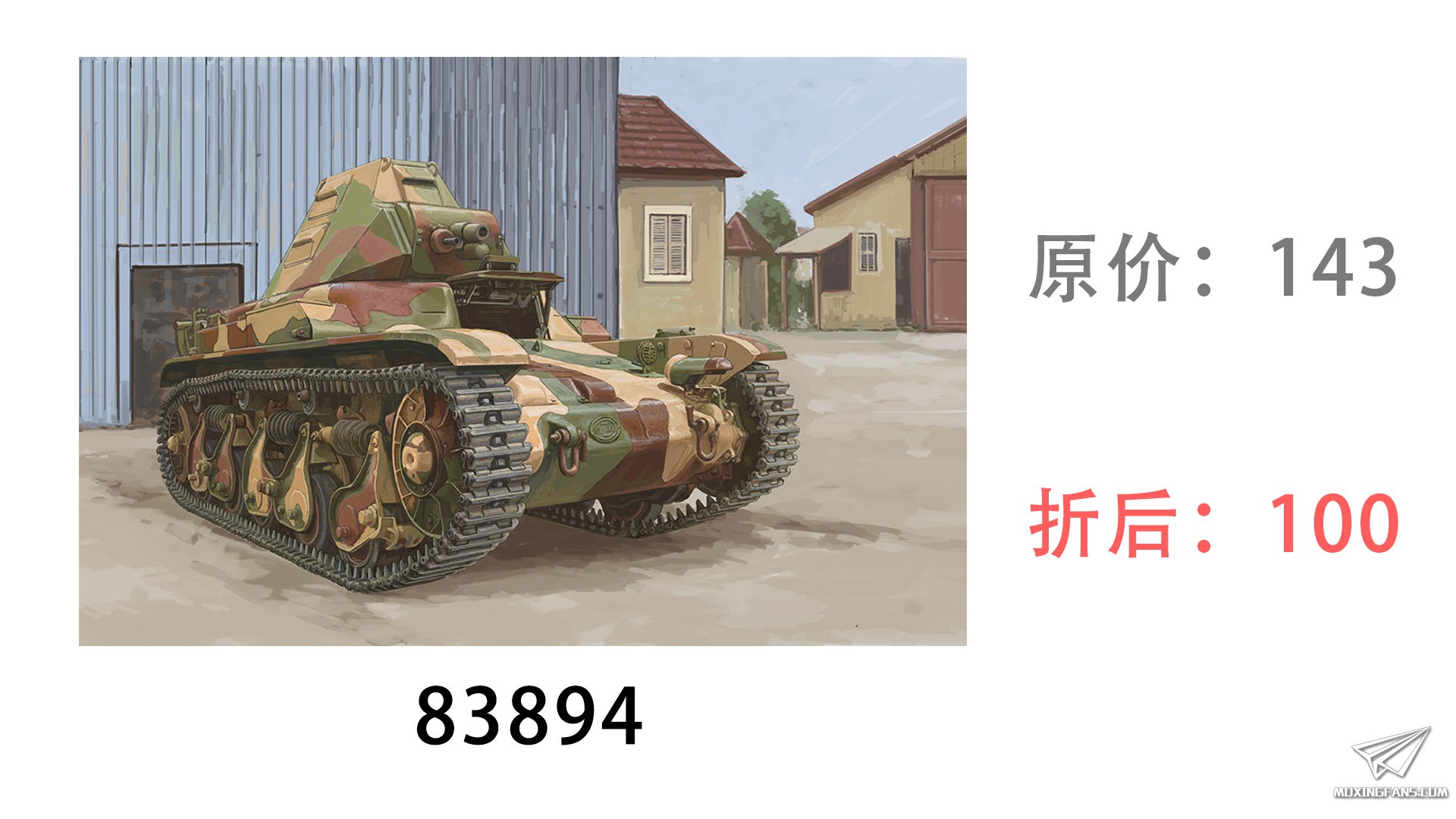 14,法国R35 FCM炮塔坦克。在模型圈里,法系车一直都有个魔咒,总是叫好不叫座,这款R35 FCM也一样。如果前几年玩过坦克世界,那一定会记得FCM36,在小车房里绝对是个BUG。这盒套件2022年上市,开出了包括发动机在内的部分内构,附带蚀刻片和半拼接履带,对于喜欢小车的模友来说值得入手玩一玩,原价143元,现价100元。