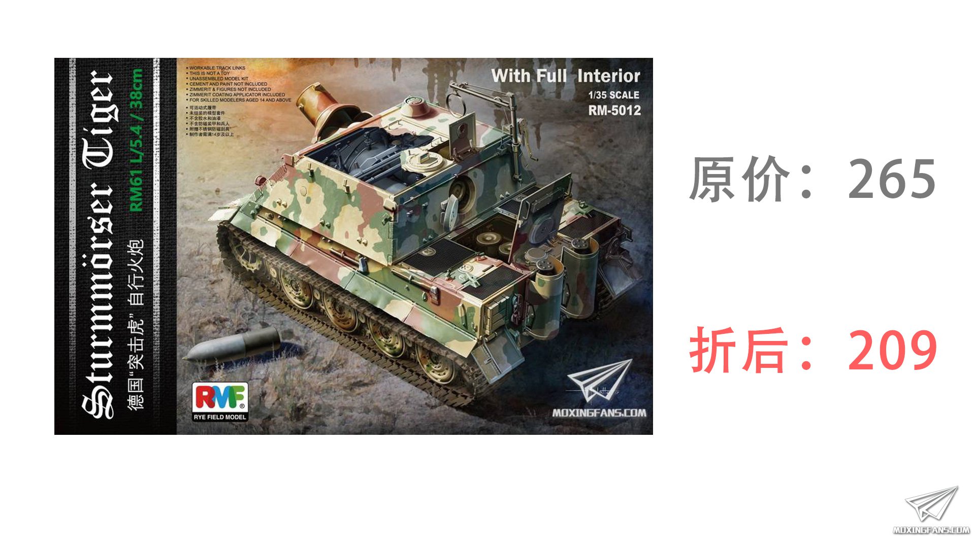 首先是全内构的突击虎。这盒套件2018年上市,是麦田突击虎中的第一款,后面又推出了一款空壳版的突击虎,也是用的这套模具。虽然推出突击虎的厂家有不少,但是全内构的突击虎麦田是独一份。对于刚入坑想要体验全内构的模友来说,相对于麦田自家的全内构普通虎,小编其实更推荐这款全内构突击虎,当然,前提是你能接受突击虎这个比较另类的造型。相对于全内购虎,这款突击虎的战斗室要清爽的多,夸张的炮弹基本把战斗室都占满了,没有传统坦克那么多零碎。说完了优点,再说下缺点,这款突击虎是麦田的早期产品,所以在合模线方面控制的并不好,细节和组合度也不如后期的产品,在素组阶段还是要花费一些精力的。这款突击虎附带蚀刻片和活动履带,官价265元,特价209元。