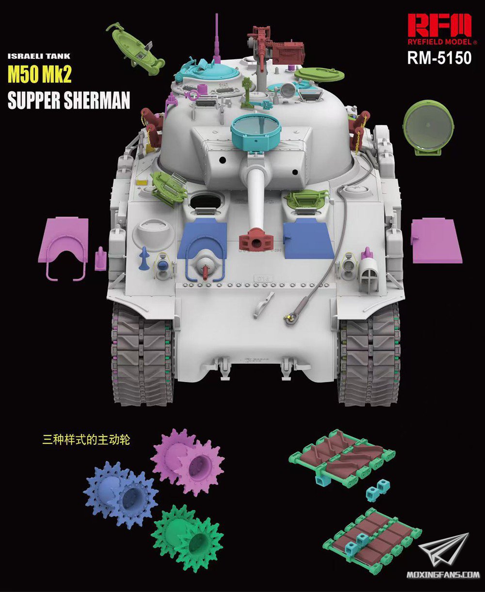 麦田的特价产品就到这里了,不知道大家感觉如何,接下来咱们来看双十一期间发布的新品。 首先是35比例的M50 MK2超级谢尔曼。知道你们想问什么,小编迷迷糊糊的查了下资料,MK1跟MK2的最大区别是发动机部分。从麦田给出的信息来看,这款M50采用活动悬挂加活动履带的配置,附带蚀刻片和3D打印零件,提供了数量可观的选装零件。另外,小编猜测这款M50的推出应该是非常匆忙的,你看配置图上的英文,超级谢尔曼都成了晚餐谢尔曼了。这款M50官价是199元。同时麦田还推出了附带更多蚀刻片和3D打印零件的高配版,官价是319元。