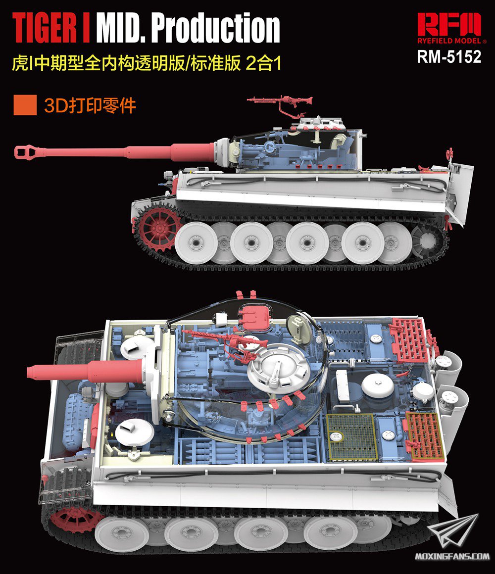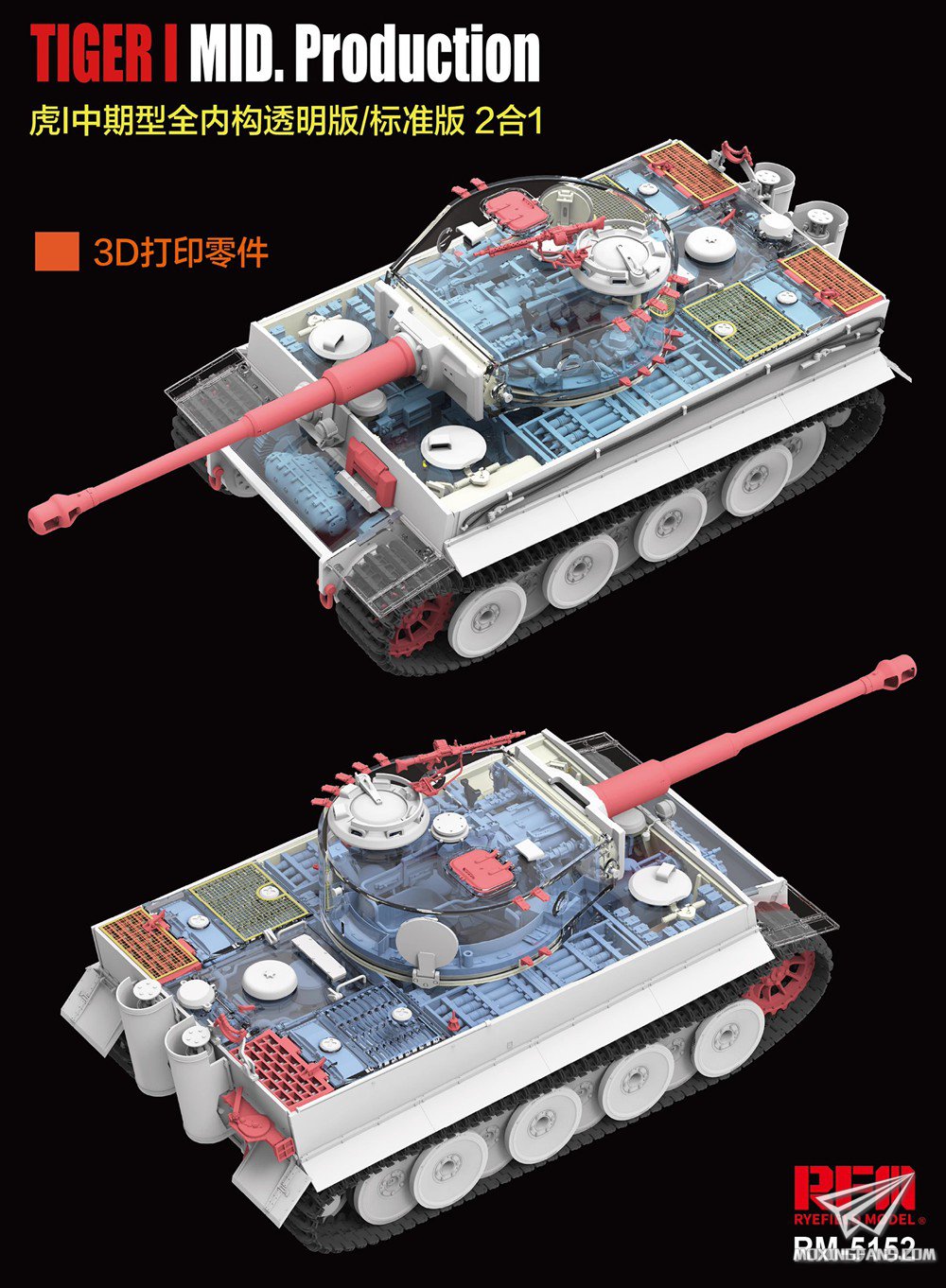 另一款新品是虎式坦克中期型全内构。小编之前说过,新手买全内构模型更推荐什么类型来着,这里就不重复了,麦田的全内构虎细节方面没问题,但是素组起来并不省心,更推荐有经验的模友制作。这盒套件全内构设计,附带蚀刻片和3D打印零件,提供了活动悬挂和活动履带,这次还提供了透明炮塔和透明上车体,官价是299元。