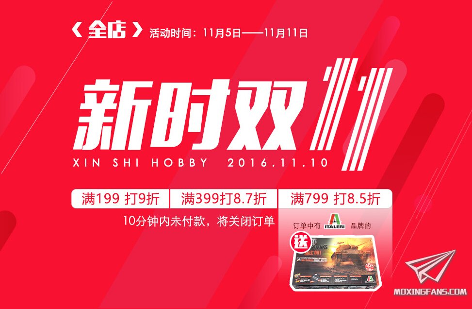 新时模型今天默默的更新了双十一的活动情况,11月5日-11月12日,全场商品均参与活动,满200打9折,满600打87折,满900打85折,送WOT版霞飞。直接打折还是比满减要靠谱一些的,只可惜没有了小号手的折上折,多少有些遗憾。...