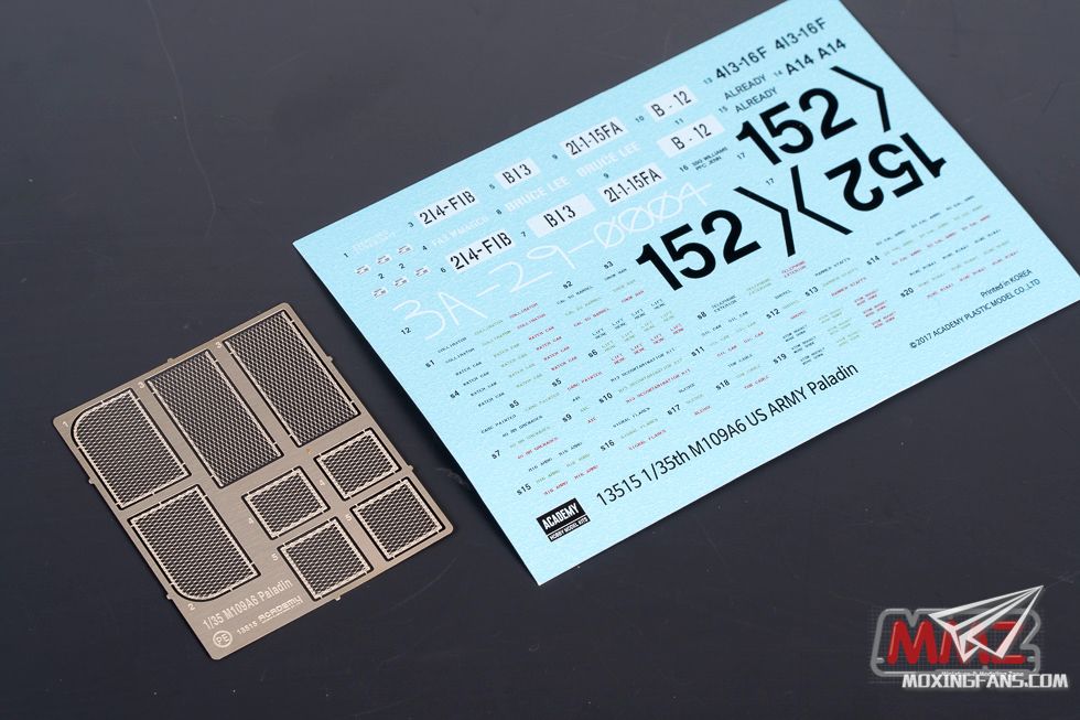 爱德美(ACADEMY)竟然不声不响的出了一盒M109A6,今天在韩国的MMZ网站看到这则消息着实吓了小编一跳。然而仔细一看,这盒M109A6的零件竟然如此熟悉,原来主体零件都是来源于意大利(Italeri)的套件,换成了灰色PS塑料,新加入了2板武器等配件,包括步枪,机枪和部分悍马的零件,增加了蚀刻片,水贴重新设计,履带依旧是橡胶履带。M109A6是目前美军现役的自行火炮,在近年来的各种战争中频繁亮相,有着不错的人气,市面上常见的1/35比例套件最常见的就是意大利和AFVCLUB的,如今爱德美又来搀和,我还是选AFV的吧。